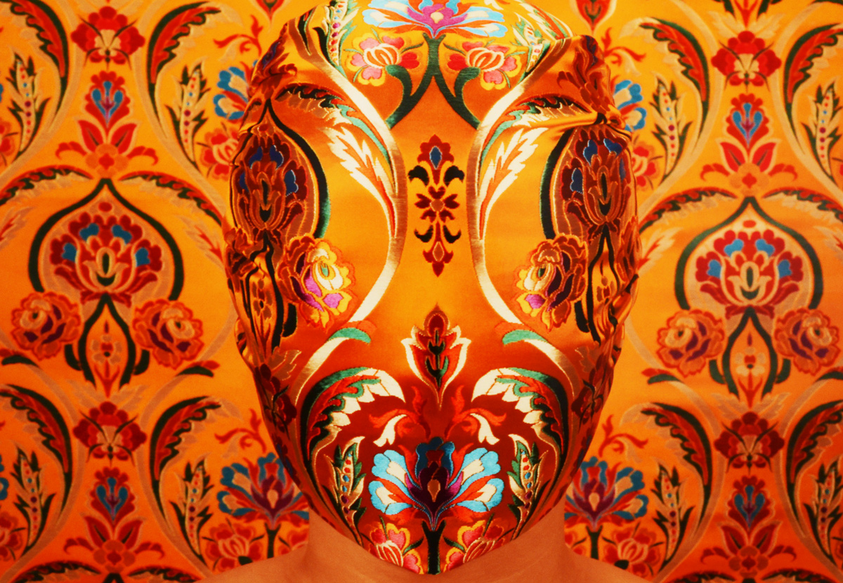 below: “Skin Deep” by Chun Hua Catherine Dong shows self-portraits ‘masked’ in Chinese silk fabrics, a gesture that implies submission.