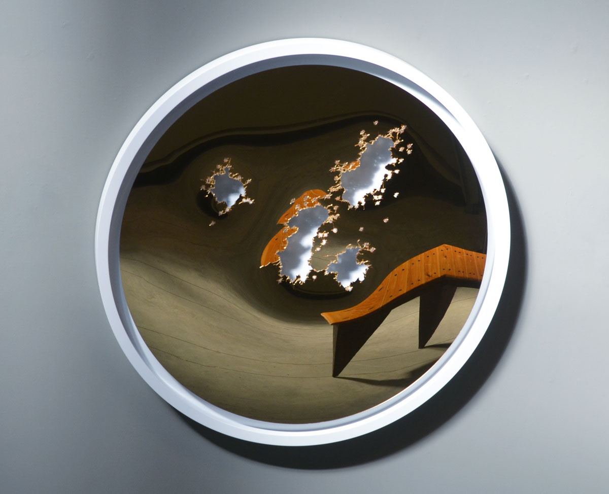 below: Kaley Flowers, cracked and broken glass to mimic water within a frame of ceramic shells, rocks and marine forms.
