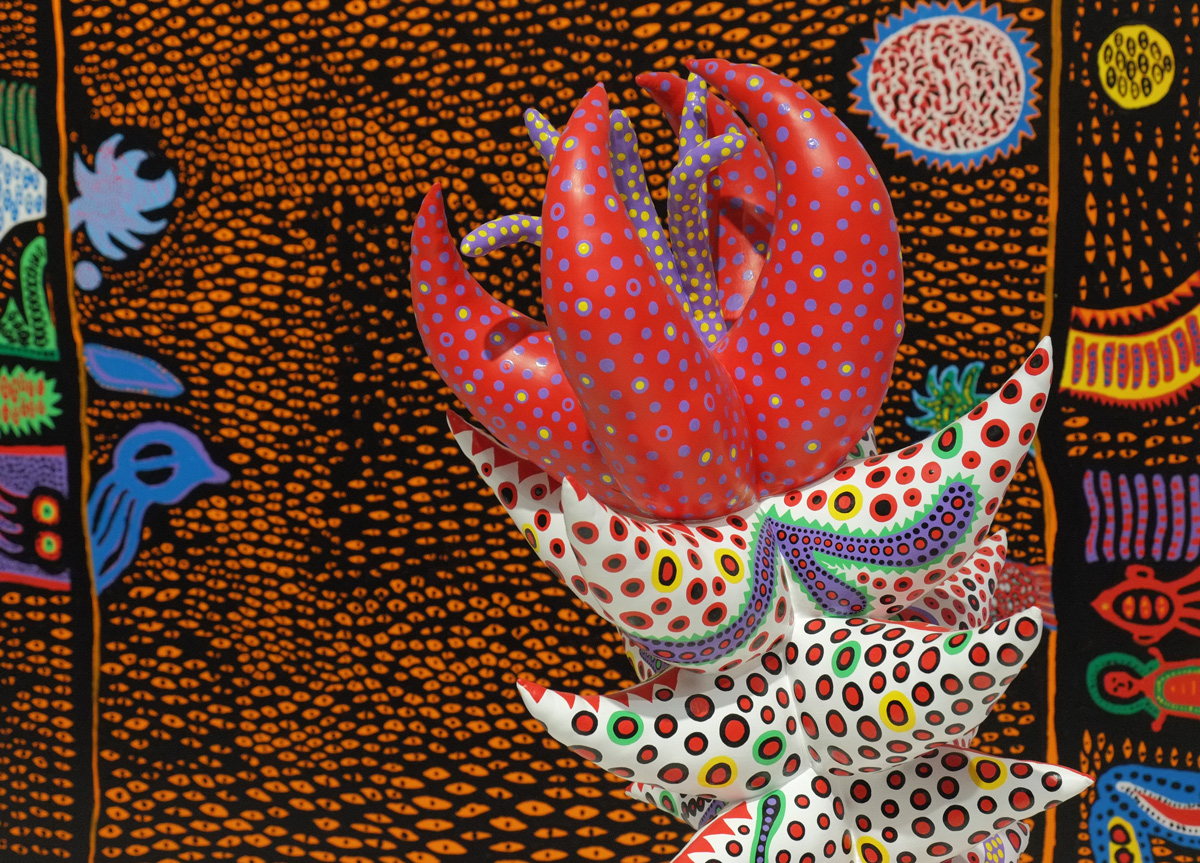 below: Large droopy flowers in weird colour combinations on a table, sculptures by Julie Moon,