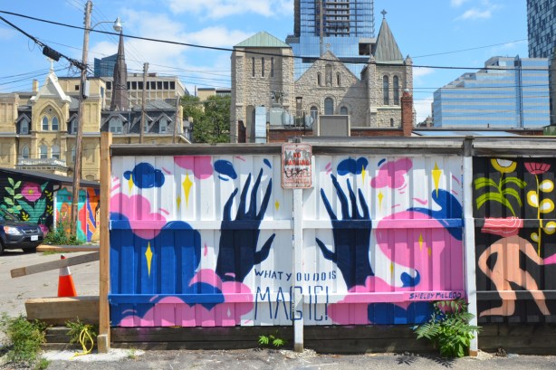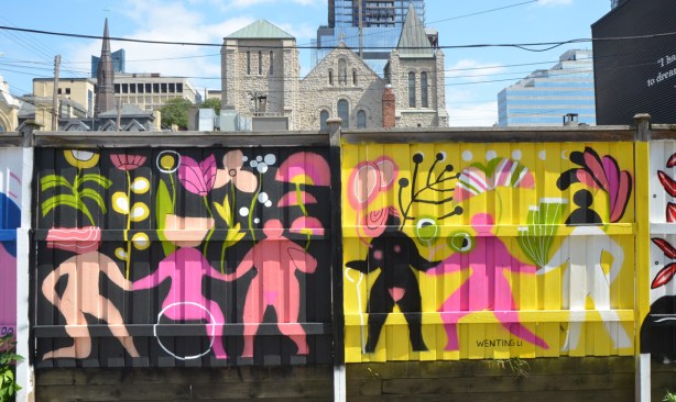 below: Arty metal panels line the south wall of Masaryk-Cowan community center. Bonar-Parkdale Presbyterian Church is in the background.