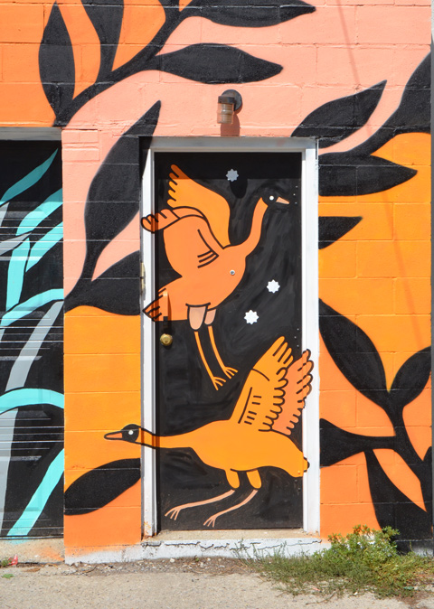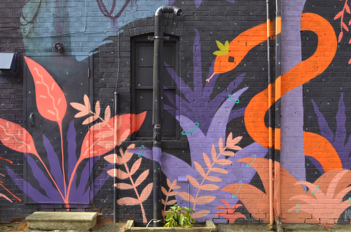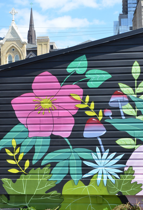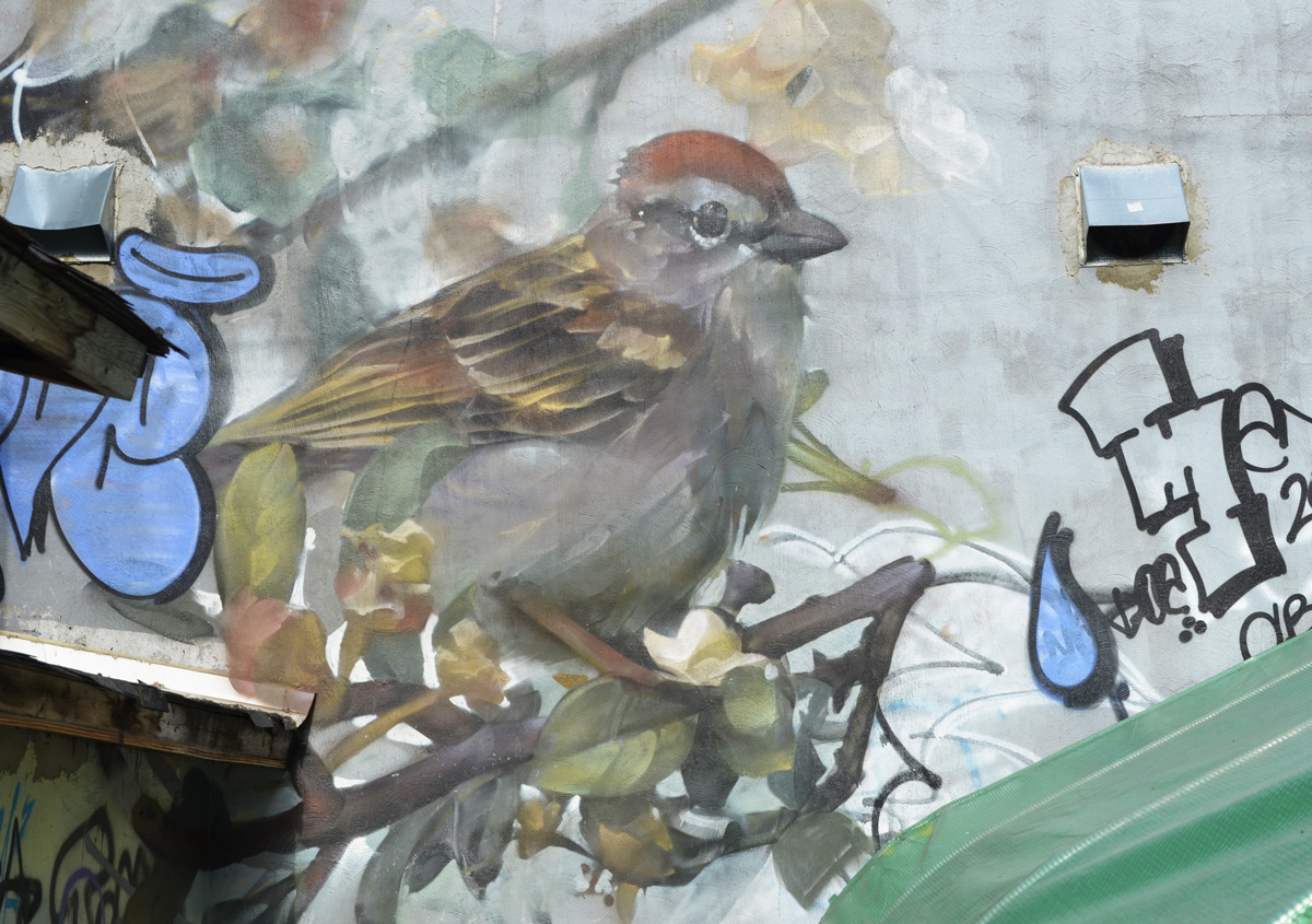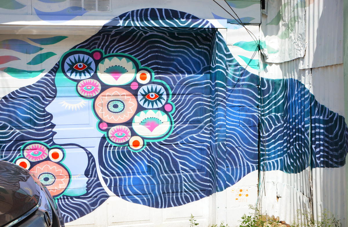 below: Murals and street art in an alley. Butterflies and monochrome daisies