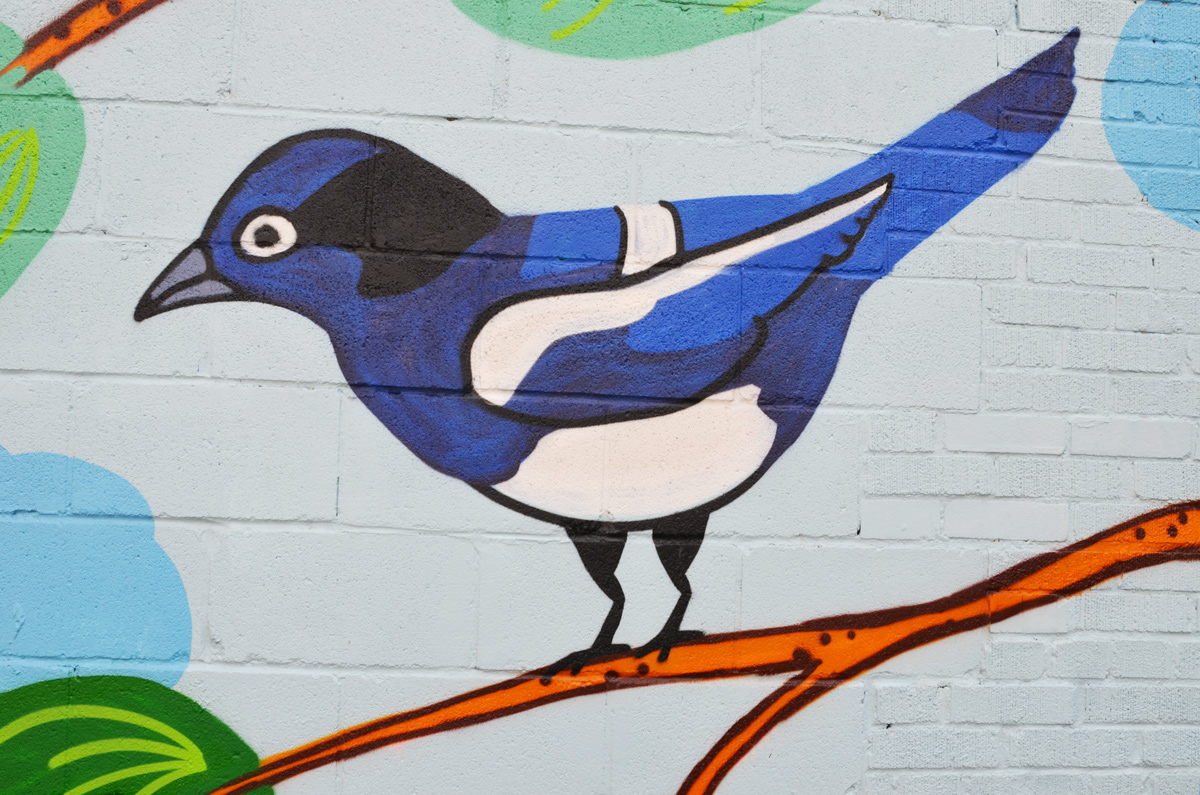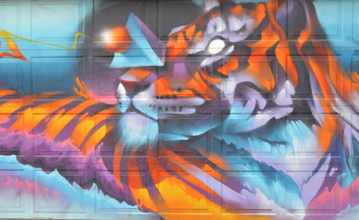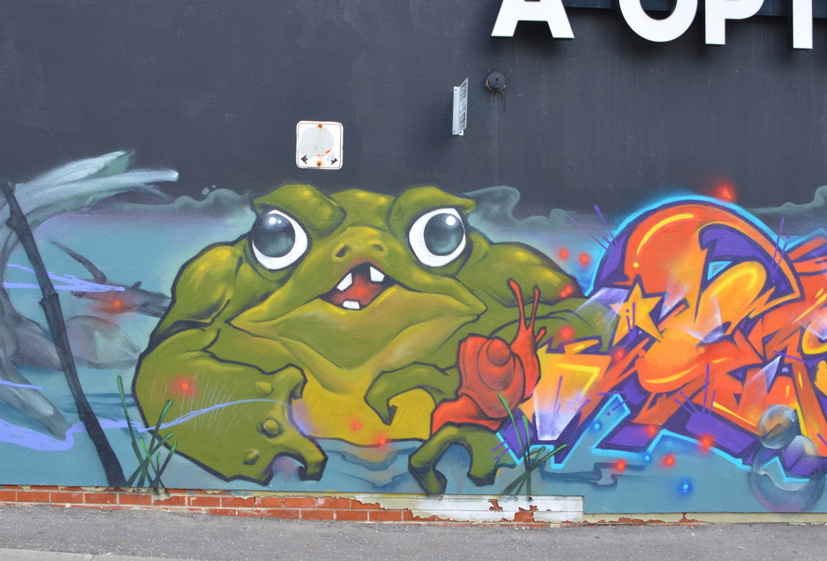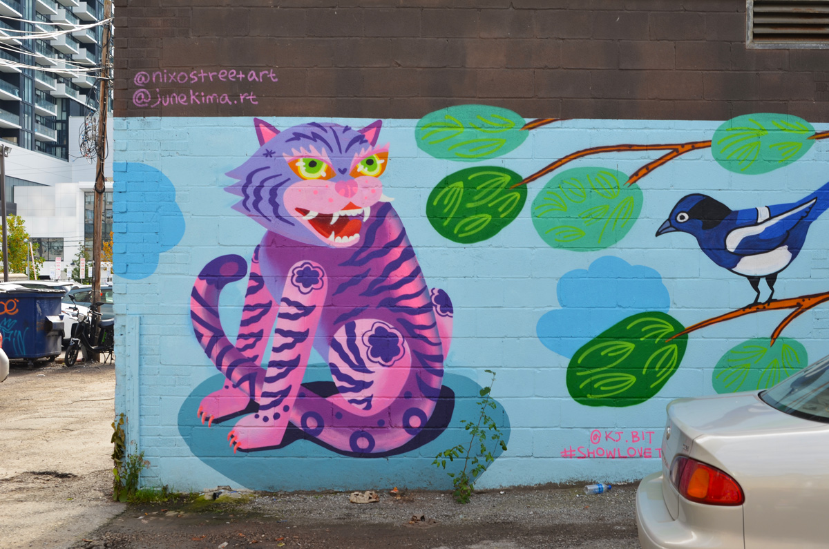below: Murals and street art in an alley. Butterflies and monochrome daisies