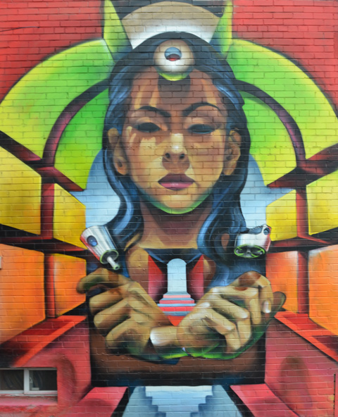 below: A mural painted by Chief Ladybird. Mother and child finding peace in the city.