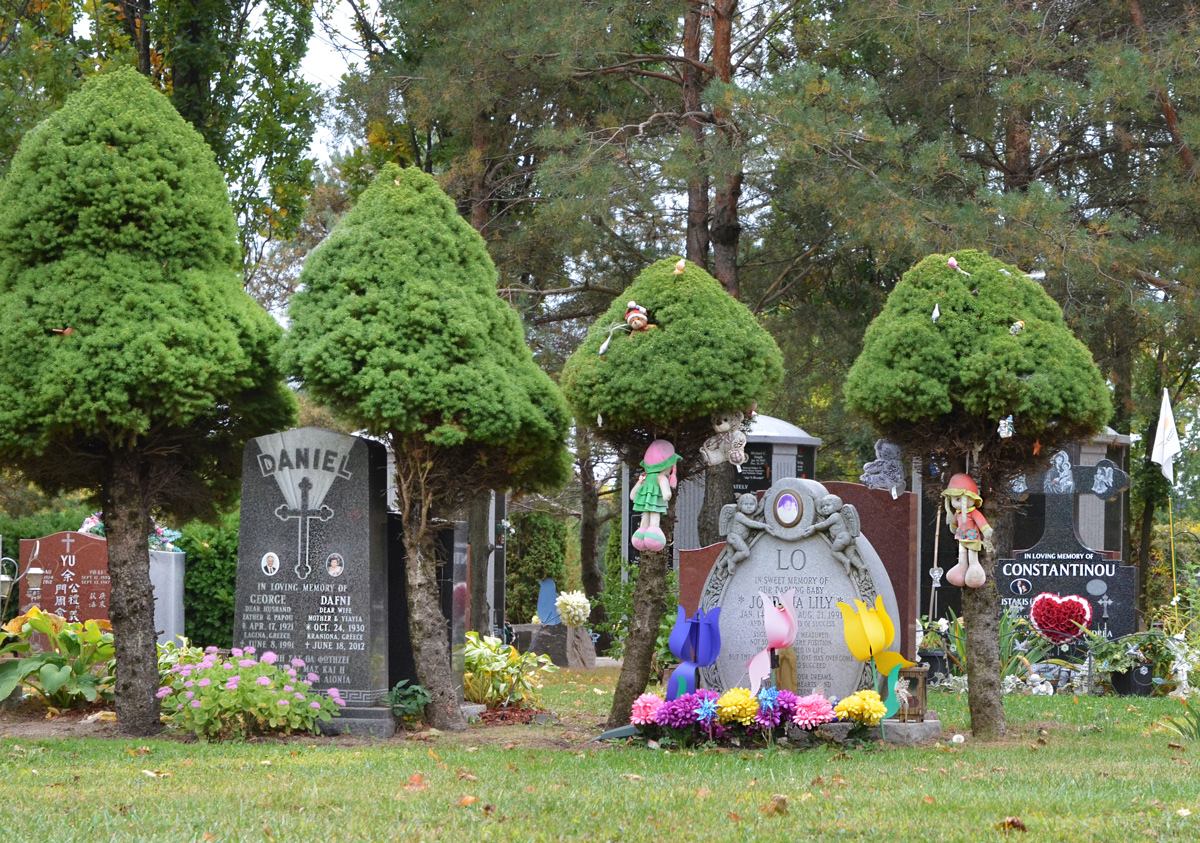 below: Last, but not least, the Just sisters. This mausoleum was originally built for Sir Frank Baillie who died in 1921. His remains were moved to Oakville in the 1960’s and the building sat empty for a few years. It was purchased by the Just family and now Gloria Irene Just (d. 1977) and Gladys Irene Just (d. 1970) are interned here. They were daughters of Thomas Fullerton Just, a mining equipment dealer from Quebec. Someone has left flowers.