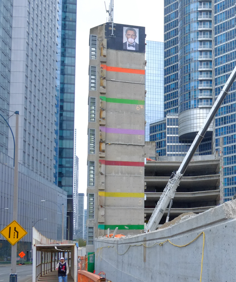 The old multi level parking garage at Lower Simcoe and the Lakeshore is on its way down. Demolition is well underway.