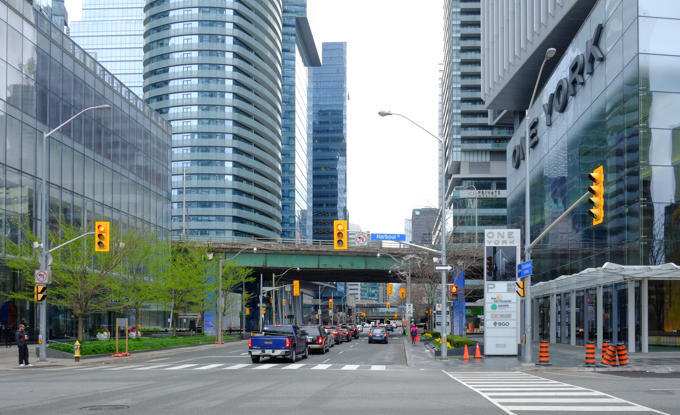 below: York Street at Lakeshore Blvd where the old green Gardiner Expressway travels directly above the Lakeshore
