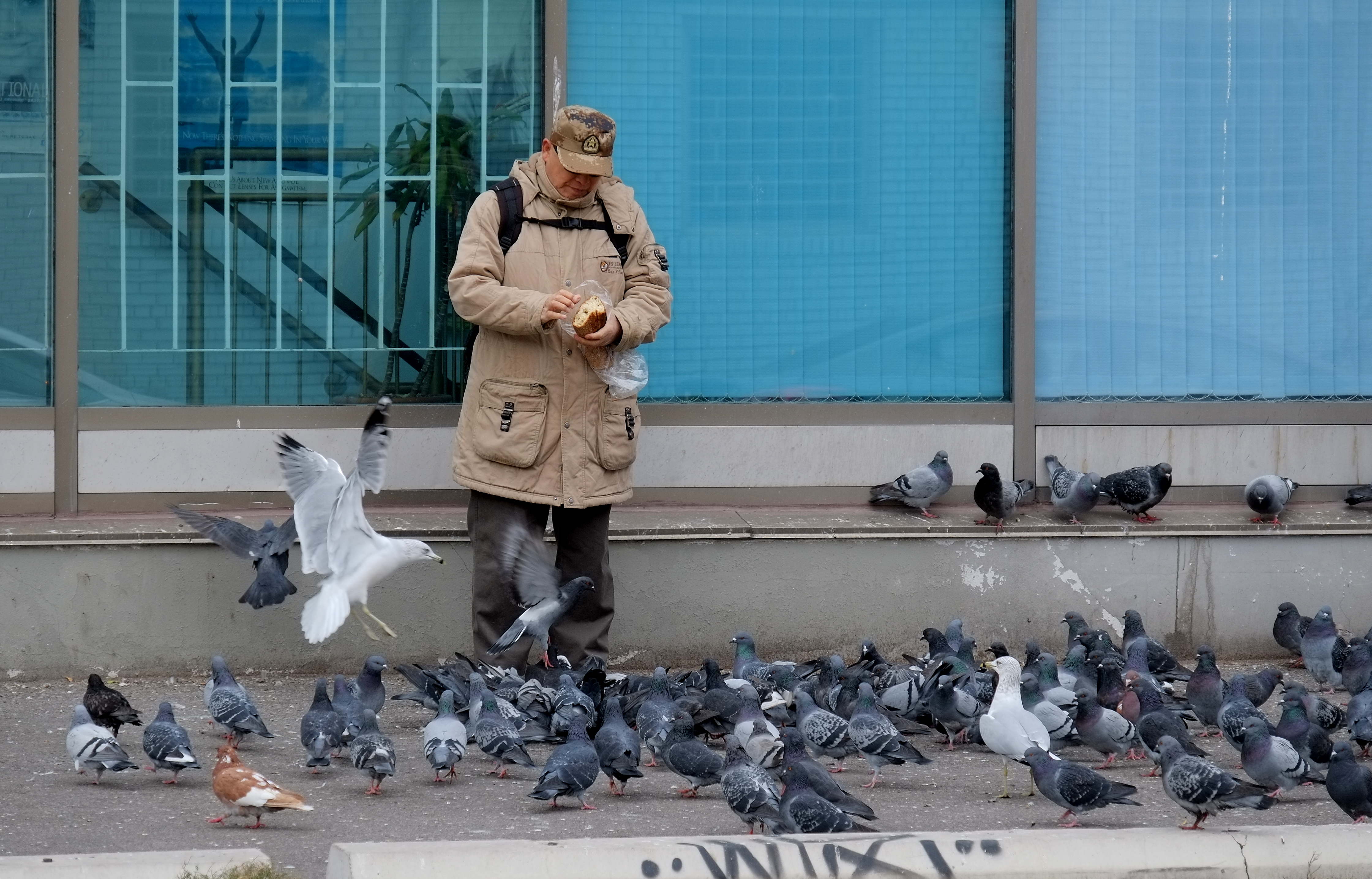 below: Feeding the pigeons.