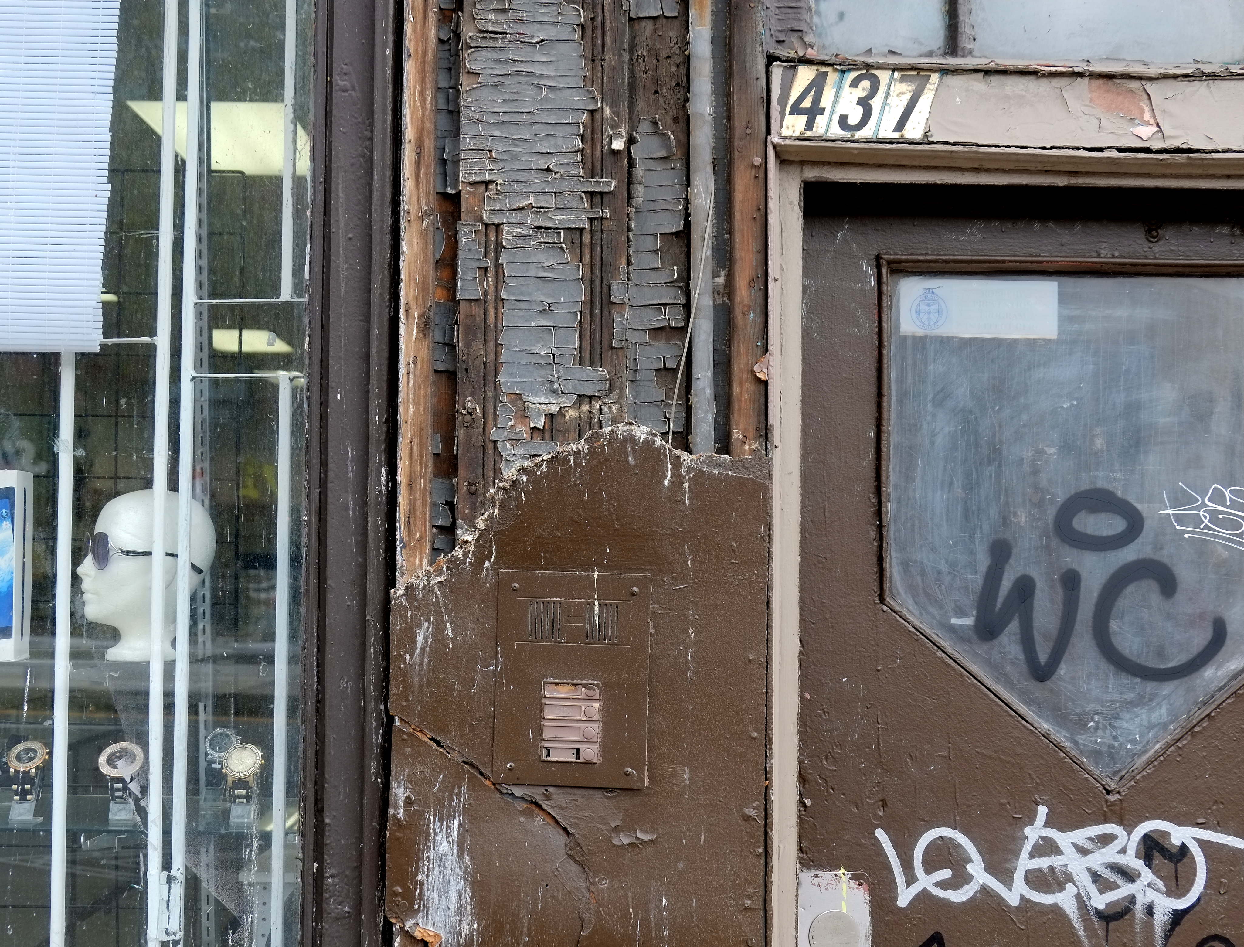 below: A painted over intercom – a remnant of the past. But the plywood that the intercom was mounted on is partially torn away to reveal an even older, more hidden, past. Does anyone live or work at 437 anymore? What lies behind the door?