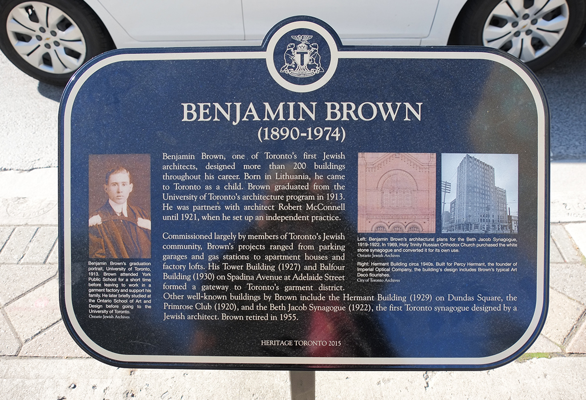 Commissioned largely by members of Toronto’s Jewish community, Brown’s projects ranged from parking garages and gas stations to apartment houses and factory lofts. His Tower Building (1927) and Balfour Building (1930) on Spadina Avenue at Adelaide Street formed a gateway to Toronto’s garment district. Other well known buildings by Brown include the Hermant Building (1929 on Dundas Square, the Primrose Club (1920) and the Beth Jacob Synagogue (1922), the first Toronto synagogue designed by a Jewish architect. Brown retired in 1955.