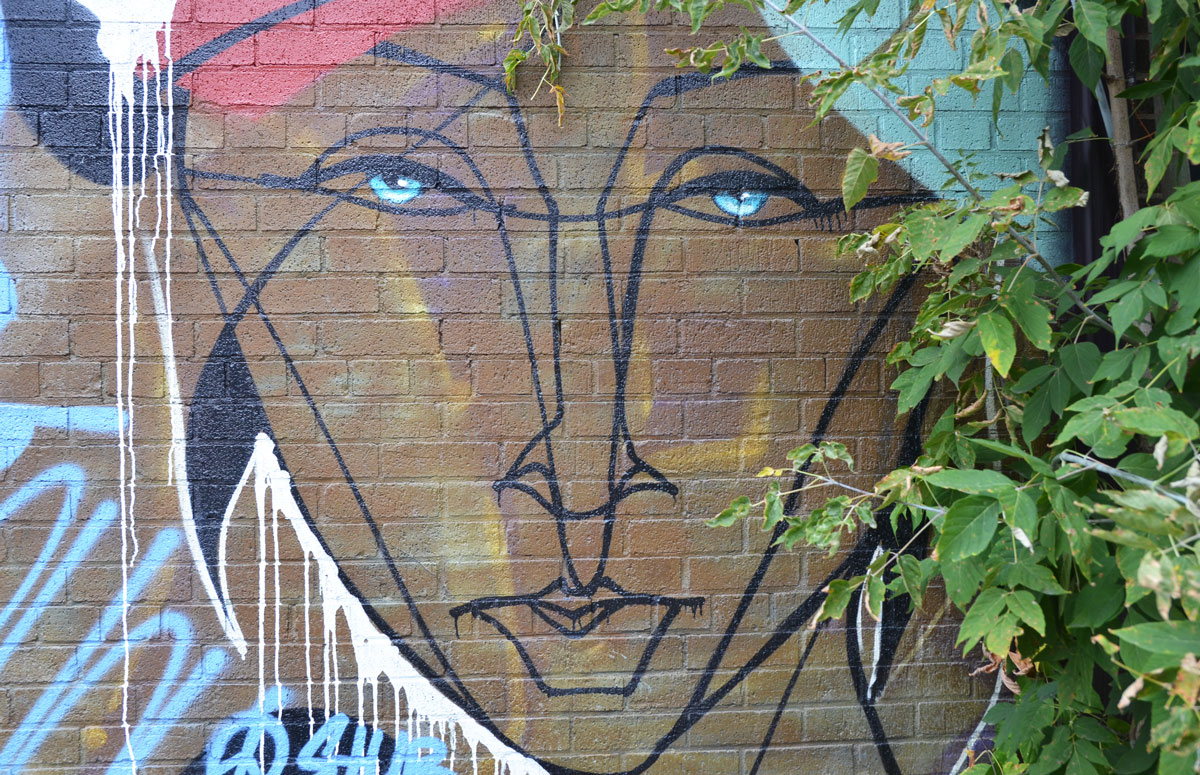 below: Potato sack racers in a mural by Jim Bravo. The sacks all say “Eva’s Fine Deli” on them so perhaps this was once the wall of said deli? Now it is the Dosa restaurant on Roncesvalles.
