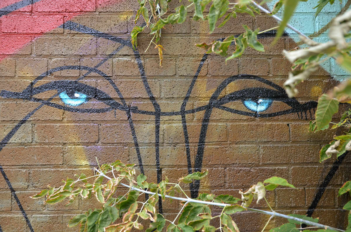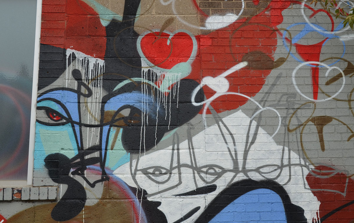 below: The original mural with its yellow convertible once seen on the back of the building is still there, it’s just hidden by a more recently built structure to store garbage bins and other stuff in.
