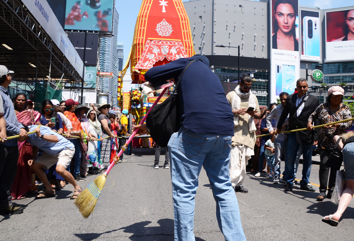 below: A small parade for the Festival of India made its way down Yonge street towards the ferry for Centre Island. Sweepers cleared the streets while other people joined together to pull the floats.