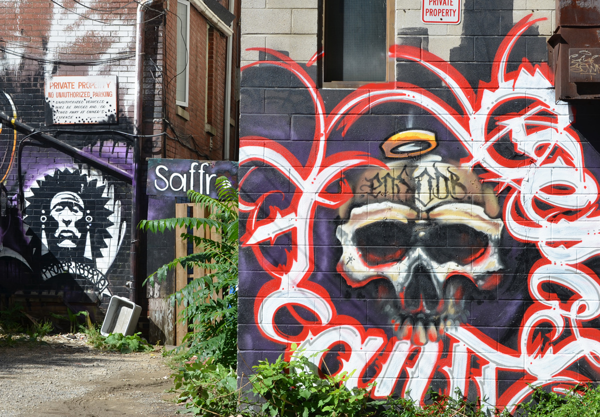below: Across the street from Branca Gomes is this mural. in 1937 Sam Sniderman, along with his brother Sidney, opened Sniderman’s Music Hall record department in the family store at 714 College Street. They later moved the store to Yonge Street where it became ‘Sam the Record Man’ (or colloquially, Sam’s). In their heyday, the early 1980s, there were 140 Sam the Record Man stores across Canada. The mural was painted by sumartist (aka Paul Glyn-Williams).