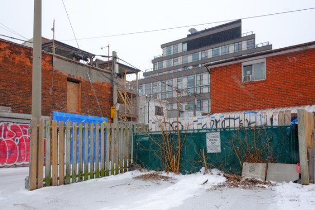 below: It looks like changes are coming on the Dundas West side of the lane as well. A concrete wall/fence has been partially demolished and there are construction fences behind some of the buildings. According to the Urban Toronto website, two 8 storey developments have been proposed – one fronting on Dundas and the other on Dufferin, with the alley remaining between them.