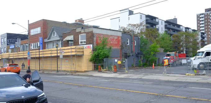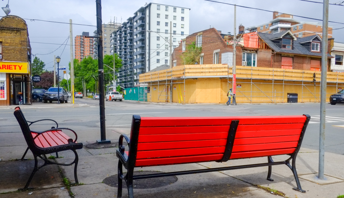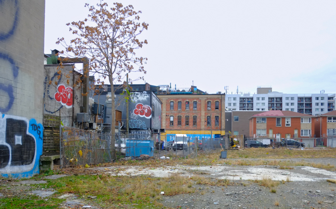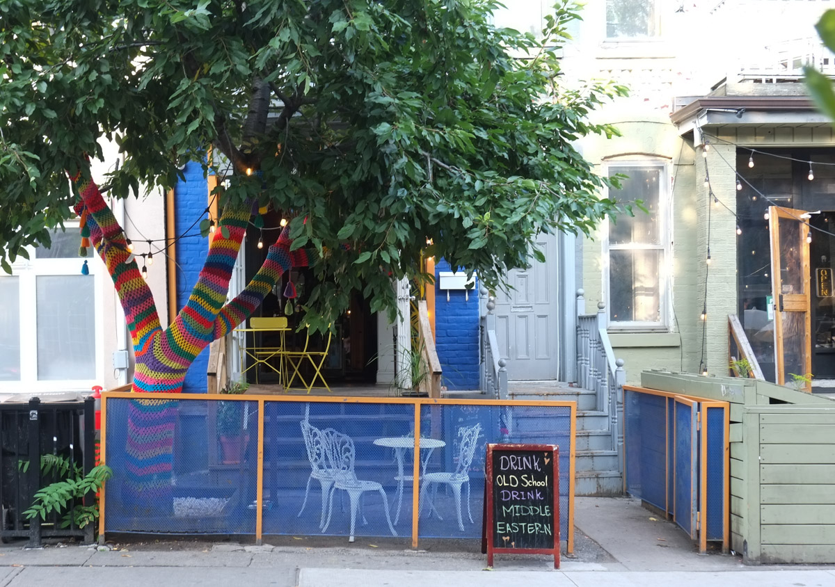 below: A temporary park has taken over a corner of the parking lot on Hanna.
