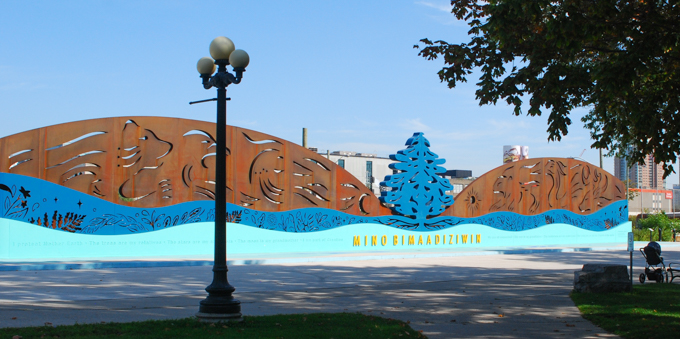 below: One of the latest public art addition to the Exhibition Grounds is “Mino Bimaadiziwin”, an Anishinaabemowin phrase that translates to “Good Life”. The mural was developed in partnership with the Mississaugas of the Credit First Nation 50-meter-long artwork honors Indigenous history and culture and was unveiled in October 2024.