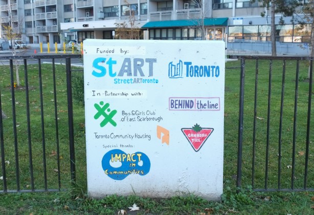 There is a railway bridge that crosses Lansdowne Ave just south of Dundas West. Along the concrete wall on the east side of the underpass is a long stretch of murals painted last year by a group of muralists and street artists. This is “Community Built”.