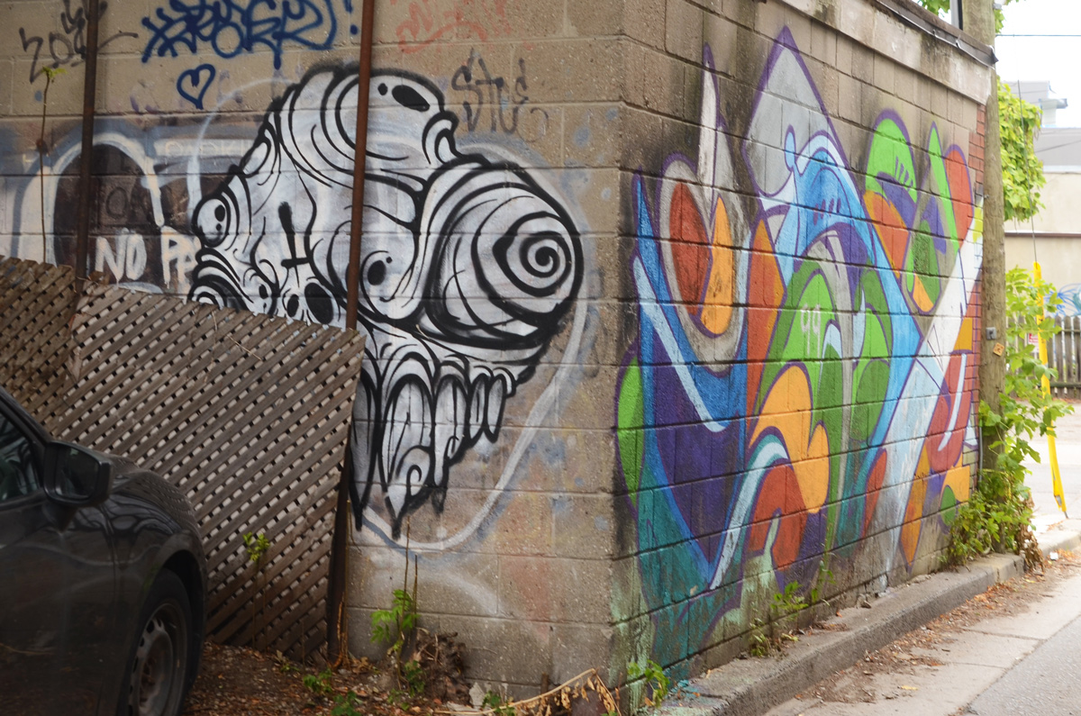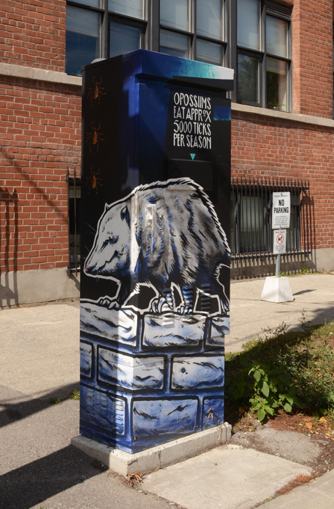 The title of the mural is “The Original Family” and it is based on an Anishinaabe creation story. The artist, Philip Cote, has been telling Anishinaabe stories through his mural painting for at least twenty years, including a series of images on the concrete supports of a bridge at Old Mill subway station (see Spirit Stories Under Old Mill in this blog).