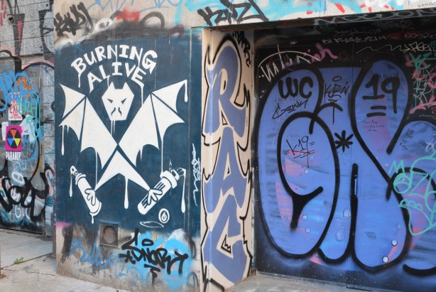 below: The curve of street car wires at Queen and Church. A wall of peeling paint, as well as a ghost sign, provides the backdrop