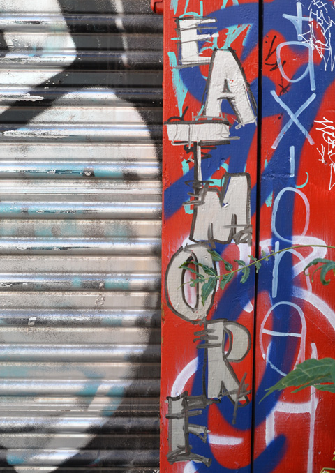 below: Pigeons, old Bell phones and the Moss Park Discount Store. Not so much light here but I liked the wall.