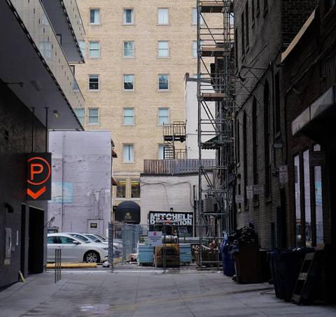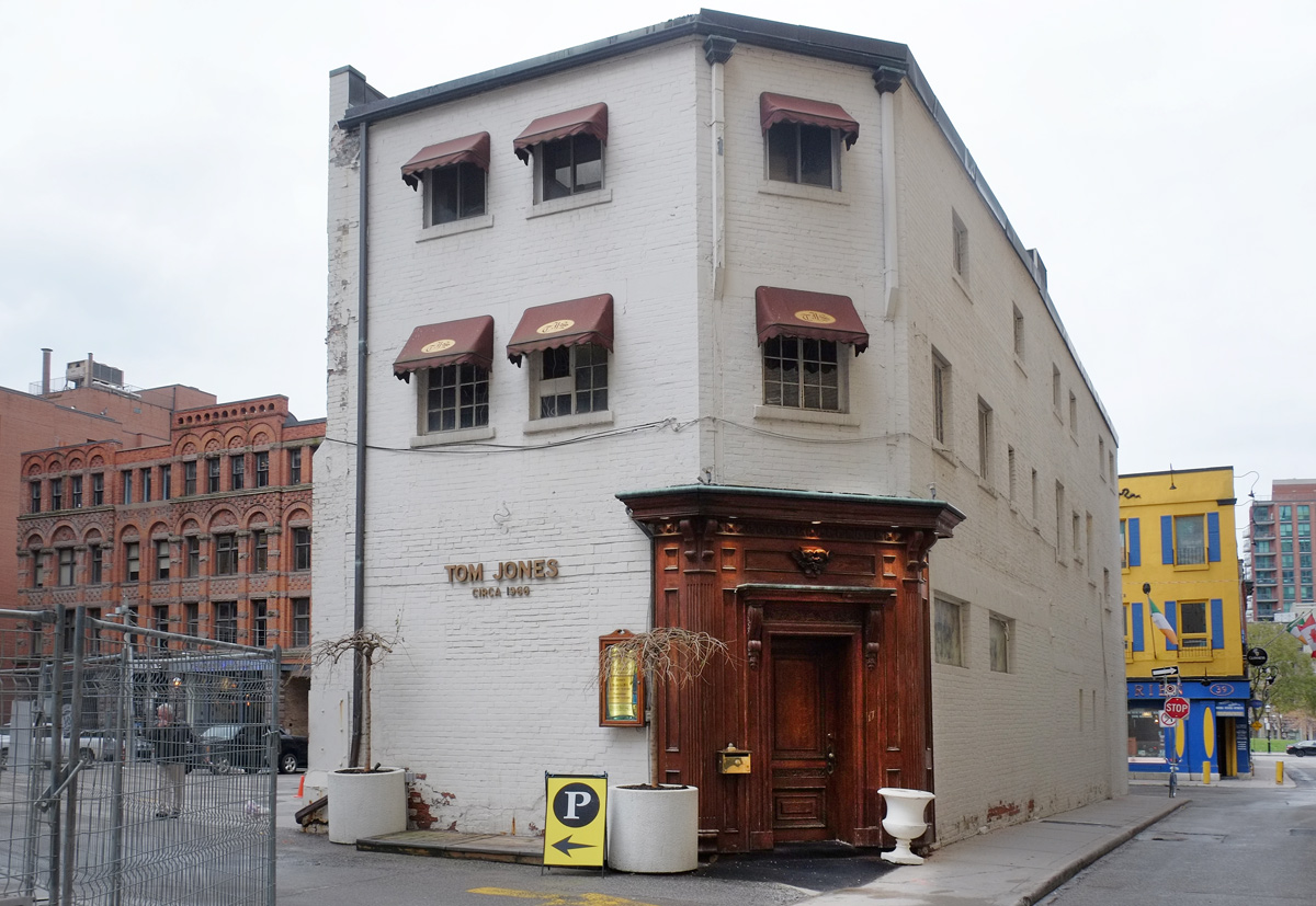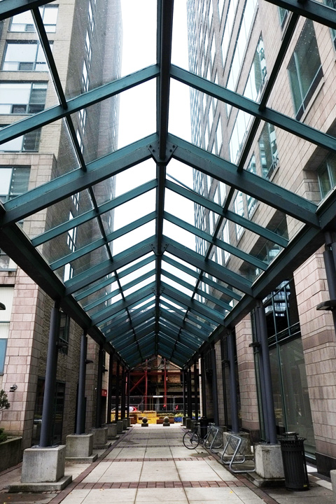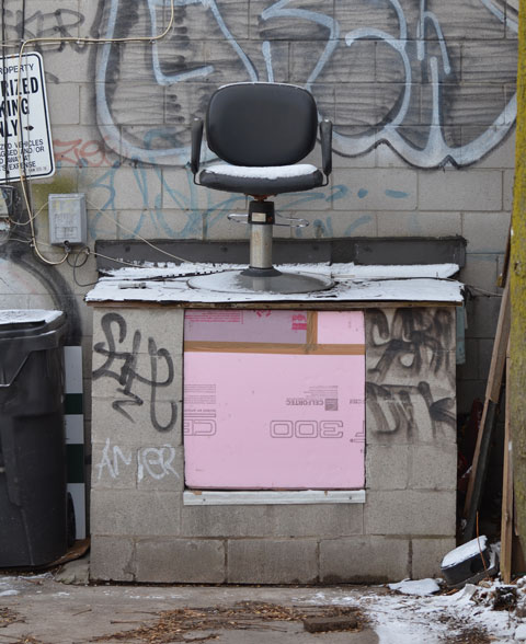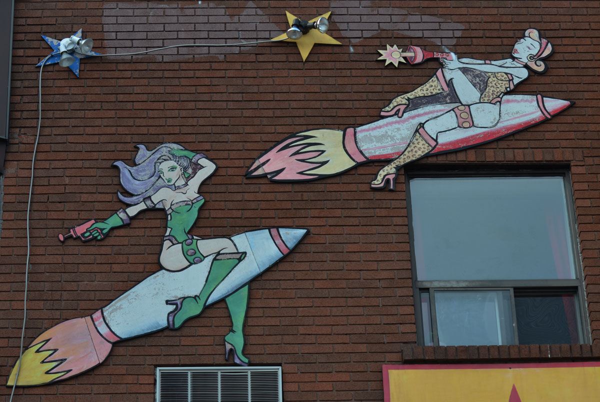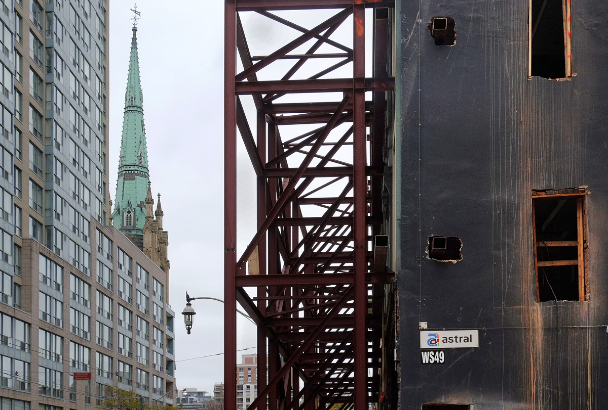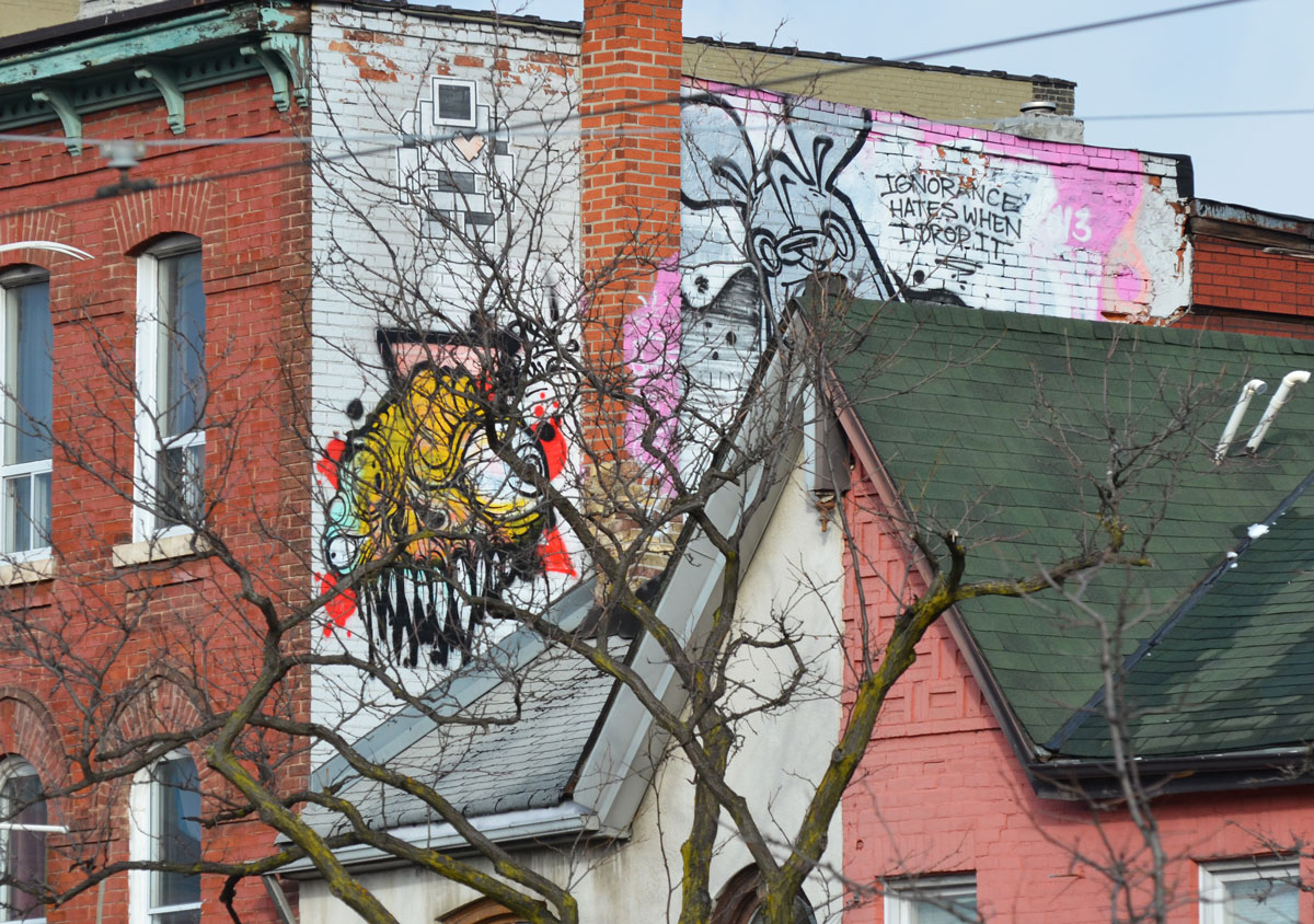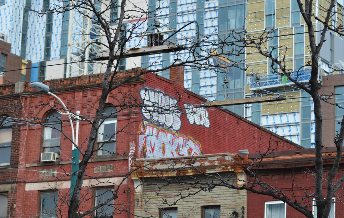 below: More rooftop graffiti. This time, with new condo development behind. The old brick buildings with glass monsters popping up behind them – a very familiar site these days.