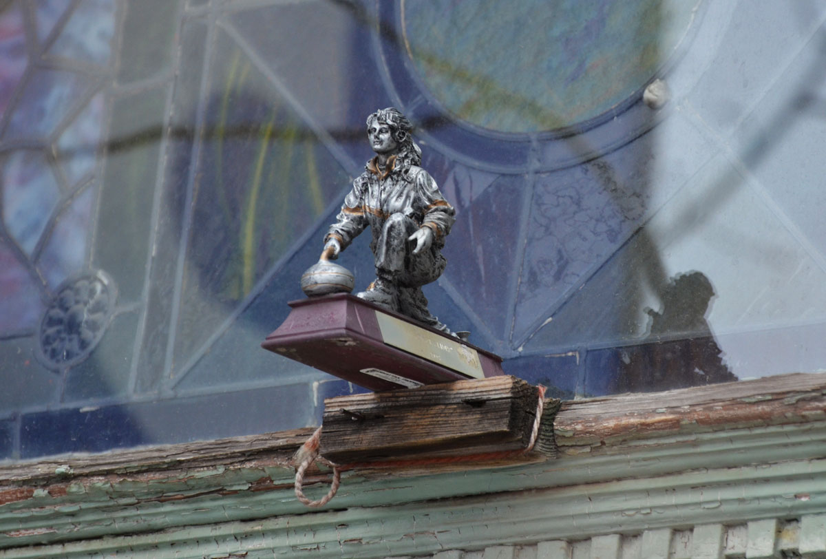 below: I thought that this was a window ornament, like the kid you see as a door knocker. But when I zoomed in more closely, I found that is was an old curling trophy!