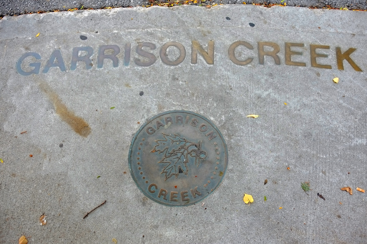 below: Letters embedded in the sidewalk where one of the branches of the Garrison Creek passes underground, just south of College Street. The creek was buried more than a century ago. In the early days, the creek was treated more like an open sewer than a river. As the city developed, the stream was diverted into underground sewers (1880’s) and streets were built above it. By 1920, almost a century ago, the stream was entirely diverted into the sewer system.