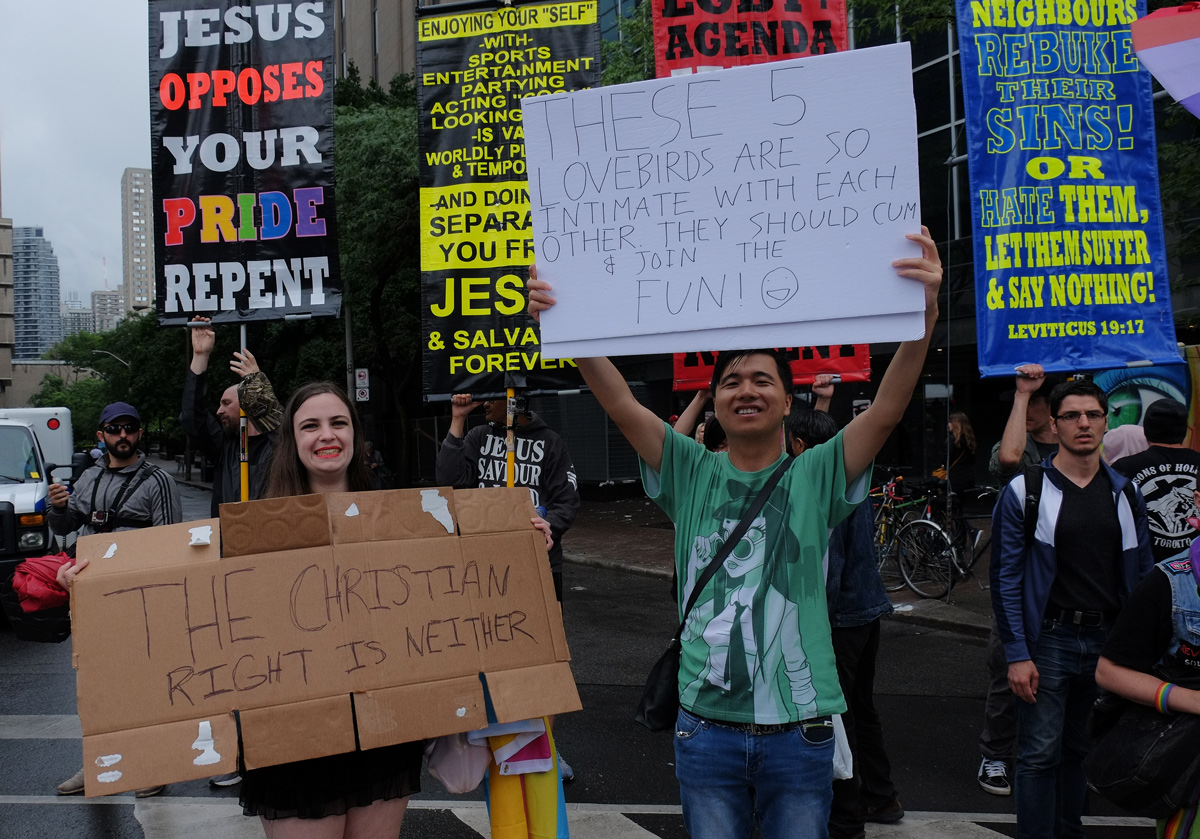 Near the end of the Pride Parade route, at Dundas and Victoria, a small group of people (all men?) congregate to protest the parade. One man has a megaphone and he uses it constantly. If you are watching the parade, it’s not a comfortable place to be unless you like the incessant high decibel assault on your ears. They have the right to be there. But supporters of the parade, and the people who participate in the parade, have found a peaceful yet effective way to counter that protest…. by quietly standing in front of them with their own signs.
