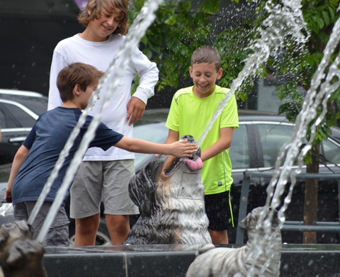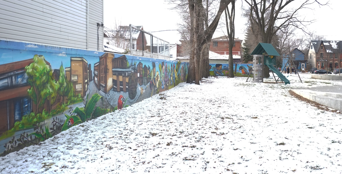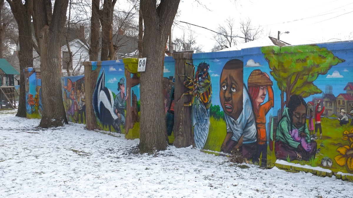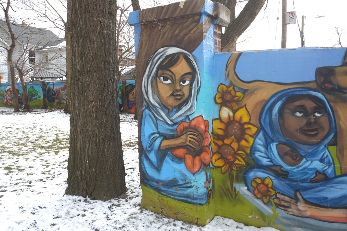 Along a wall beside the playground at 103 and 105 West Lodge is a mural painted by Elicser Elliot and Nick Sweetman a couple of years ago. It’s theme is the outdoors and it includes scenes like kids playing baseball, people reading and sitting outside, as well as people planting gardens. There are also lots of animals – a large dragonfly shows off its wings, bees fly by, squirrels hoard nuts, a robin pulls a pink worm out of the ground, and a very large hedgehog sniffs the flowers.