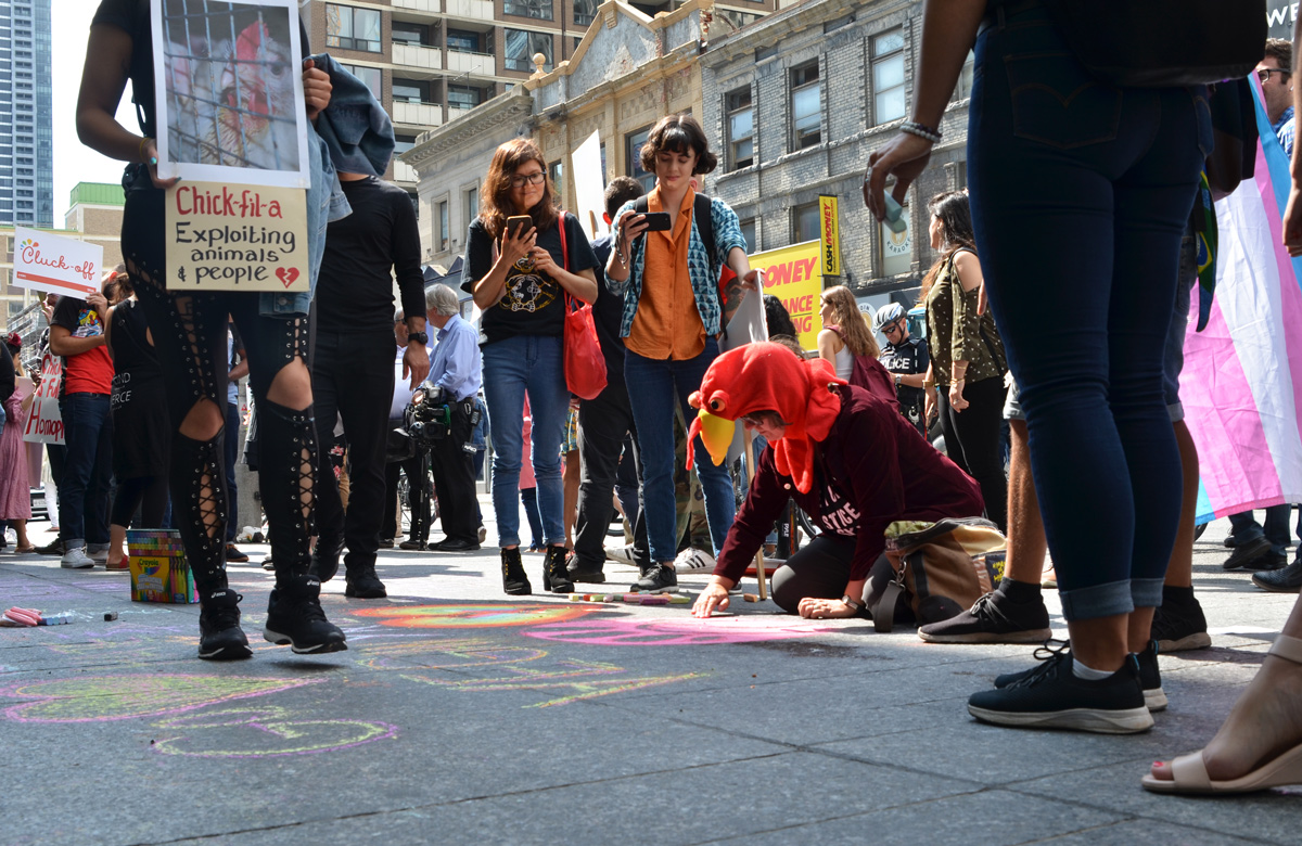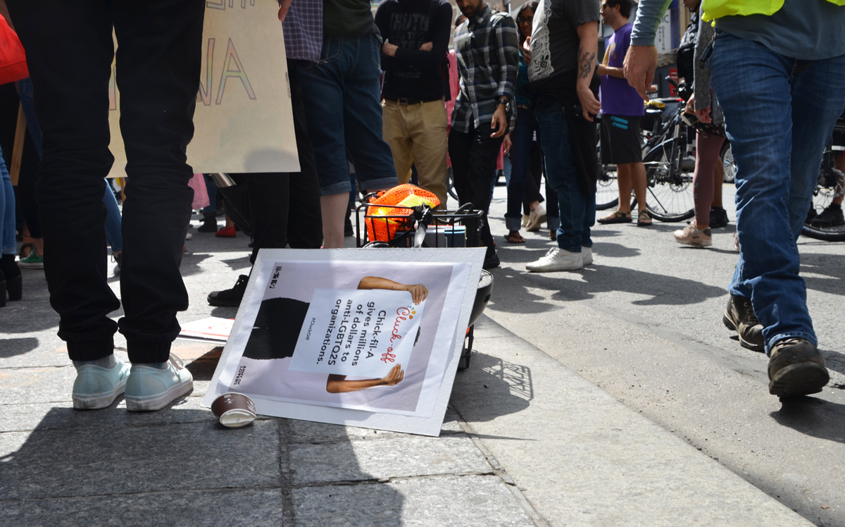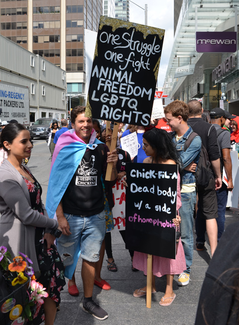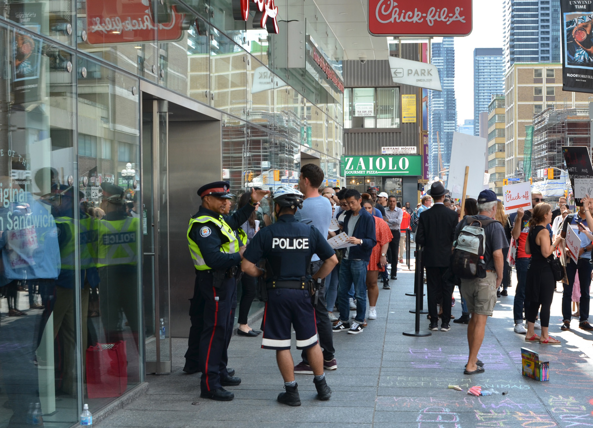 or maybe chicken fight. ‘Fight’ seemed a little too violent whereas ‘squabble’ seems to minimize the protesters concerns. Somewhere in the middle lies the truth perhaps. I am referring to the scene outside Canada’s first Chick Fil A restaurant here in Toronto – at Yonge and Bloor of all places.