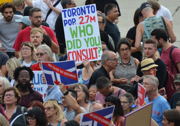 people at a rally protesting against Donald Trump as President of the USA, a wet rainy day, looking out over Nathan Phillips Square with city hall, the 3D Toronto sign and many umbrellas