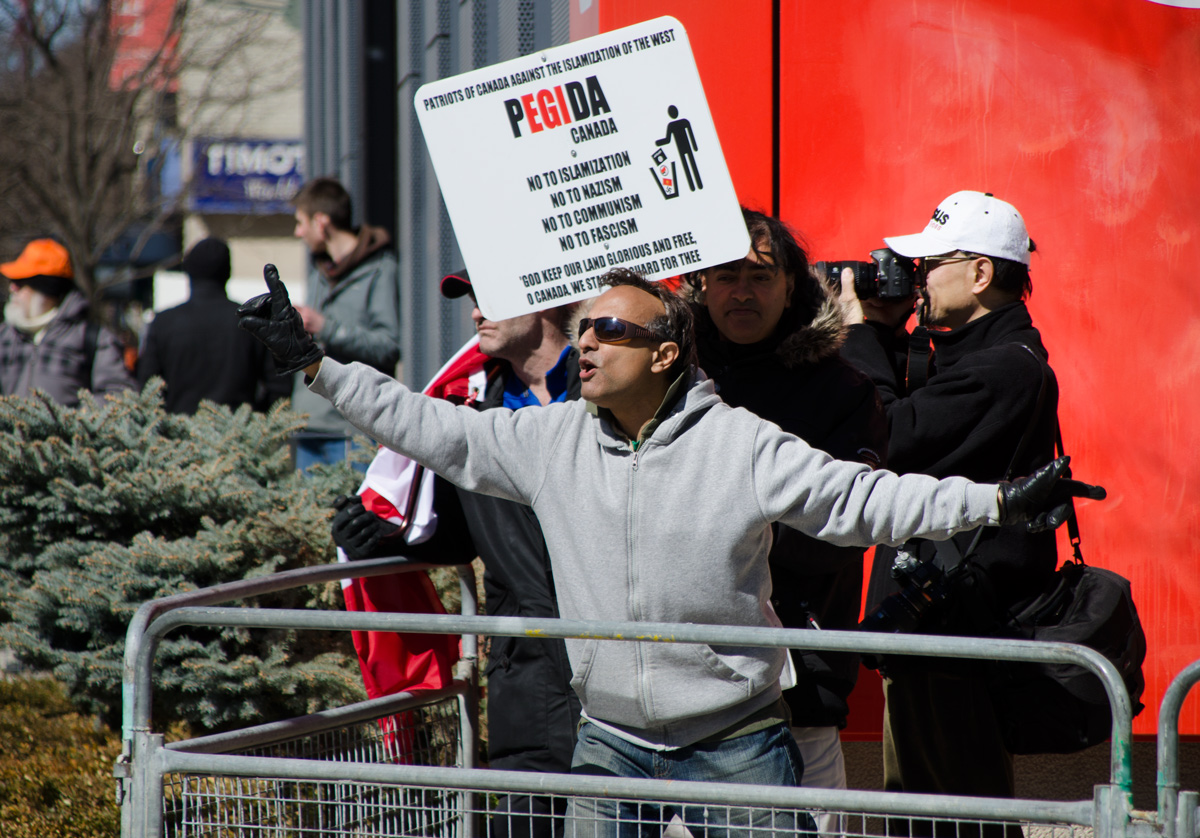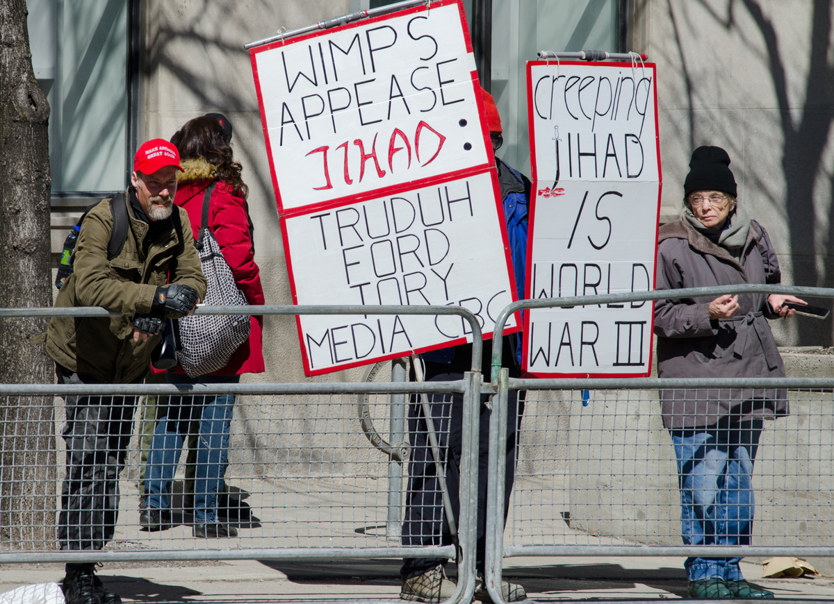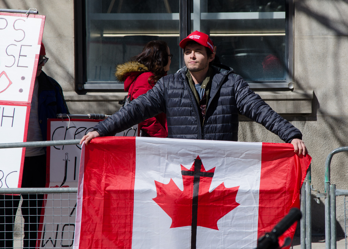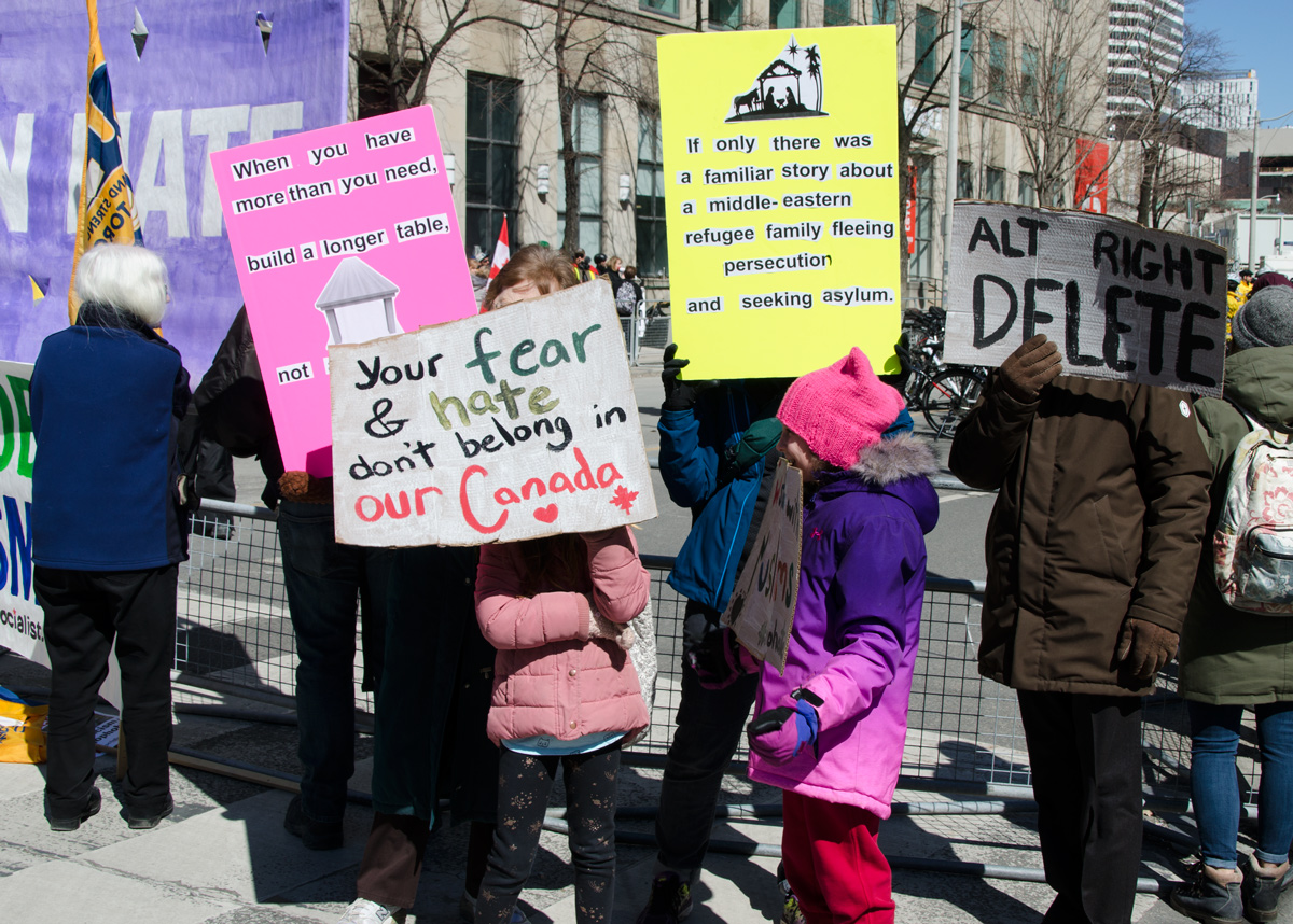 people at a rally protesting against Donald Trump as President of the USA, a woman in a yellow raincoat holds two signs, one says Trump FYI Canada rejects bigotry and the other says Trump no to you divisiveness, sexual assault and racism