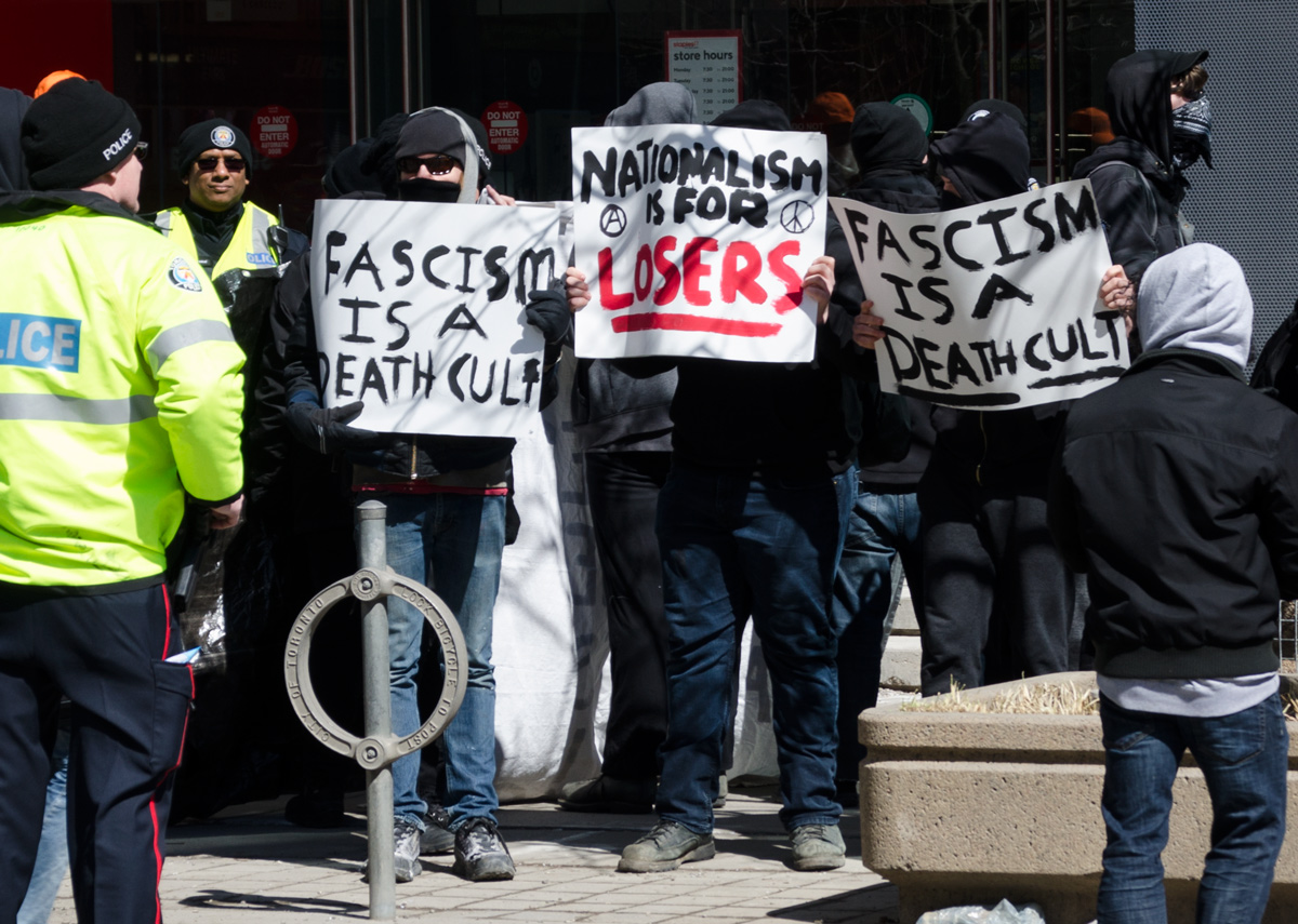 a woman holds the American flag upside down.  The words stop the fascists have been added to the flag with tape .  a protest rally at Nathan Phillips Square on a rainy day