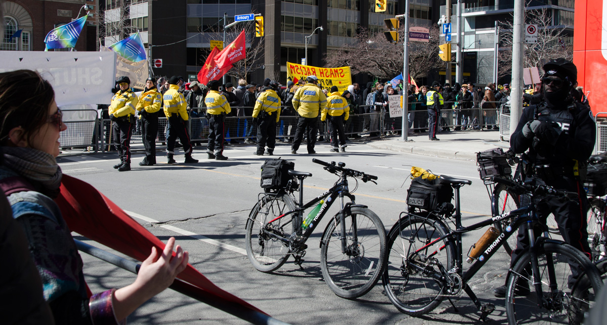 a father and son by the light purple O in the 3D Toronto sign. In the background is a group of people at a protest