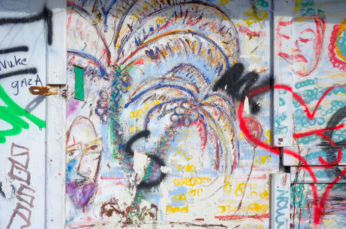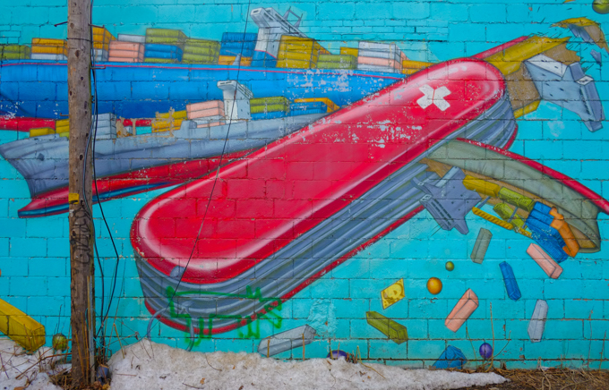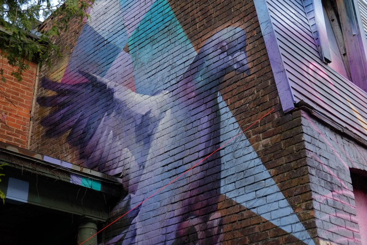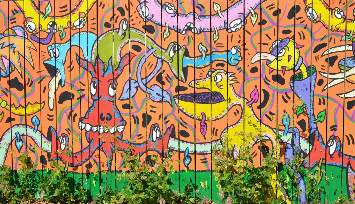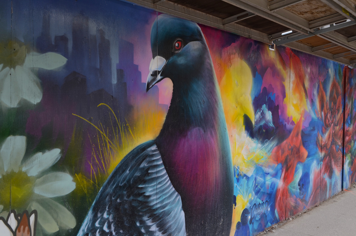 below: This aquatic themed mural dates from 2016 when a group of artists painted many murals in the area, all with the Great Lakes as their theme. They were part of Pangeaseed Foundation’s Seawalls for Oceans project. Some artworks have survived better than others. Love letters in paint is a post from 2016 that show most of them in their original form.