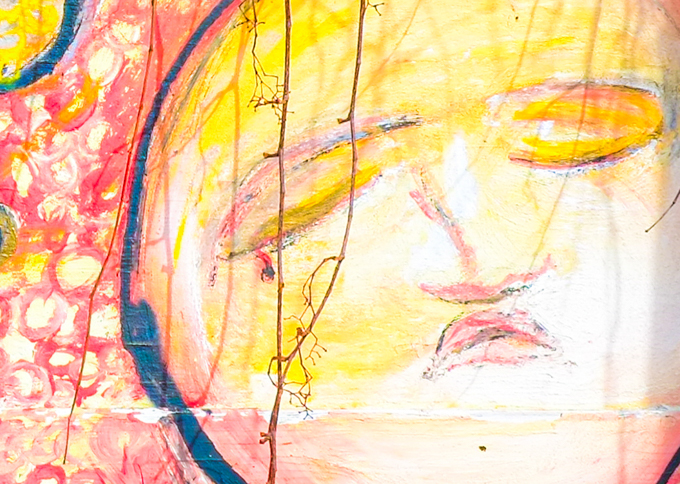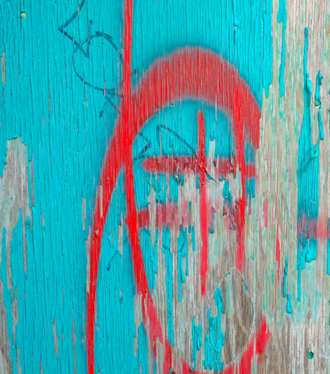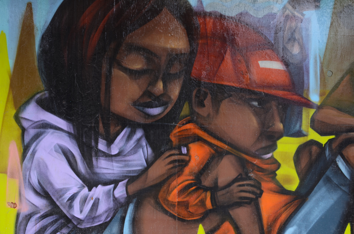 below: Close up of part of a mural, a young man wearing a black mask over his eyes.