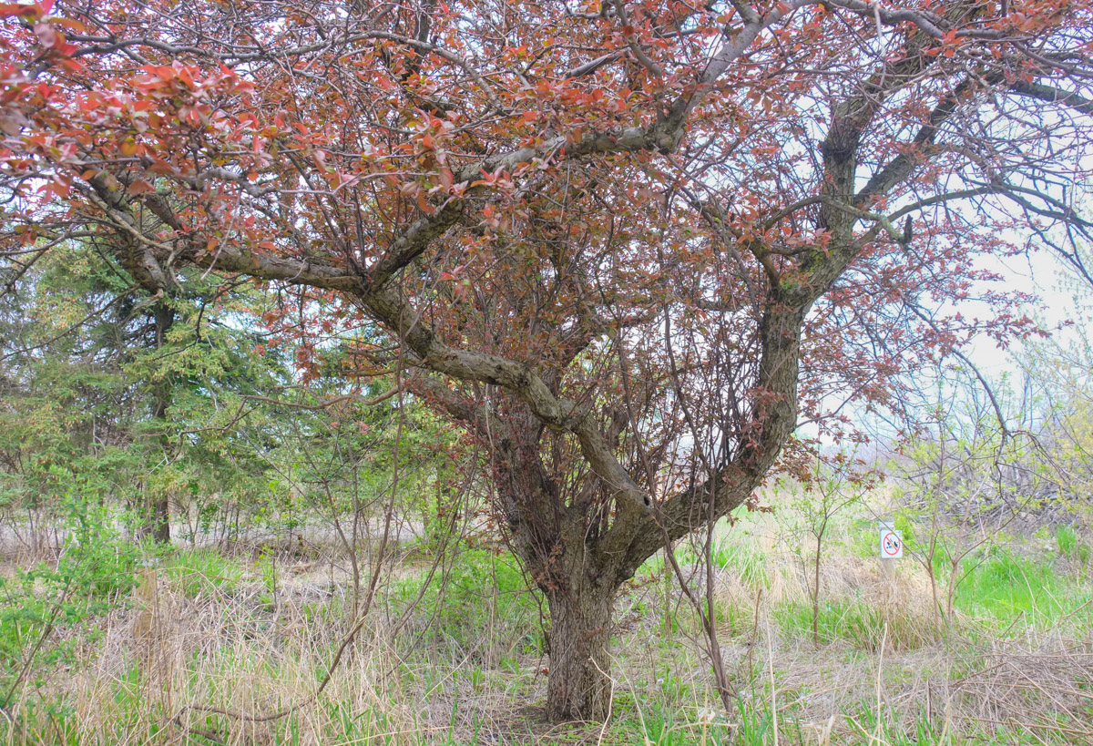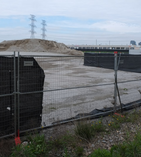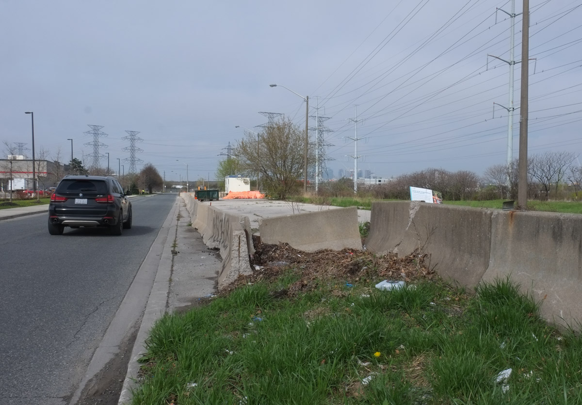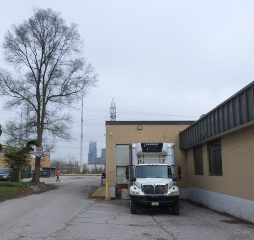 below: An old square brick building, garages and fences with graffiti, old trees, and a row of houses at the end of the lane – this captures the look of a typical Toronto lane.