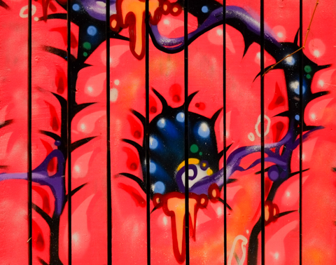 below: Hearts on fire, burning love, and the fireman that is trying to extinguish the flames – in a mural created by D. Terra Stencils.