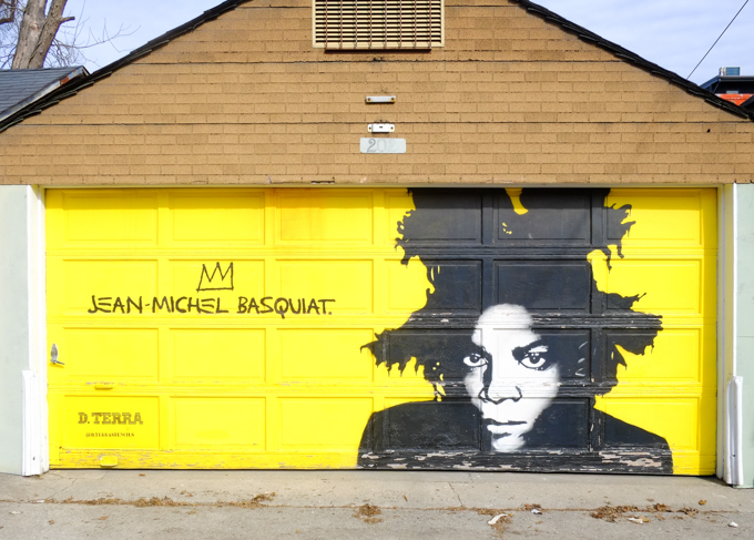 below: On a bright yellow background, an image of Jean Michel Basquiat, one of the original creators present-day street art.