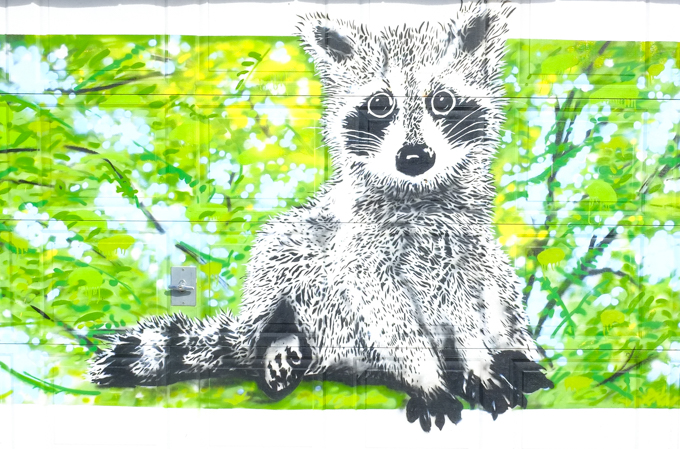 below: Some more cute raccoons of a different sort go camping in a mural by Emily May Rose