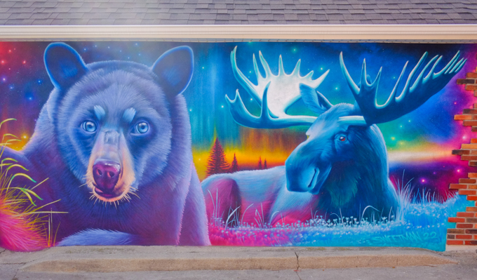 below: Nick Sweetman has used shades of blue and purple to create this wonderful northern scene with a bear and moose combo.