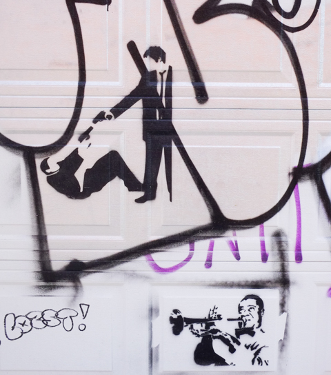 below: Smaller black stencil graffiti on a white garage door – an iconic image of Marilyn Monroe as well as a Kung fu Panda. The other woman gets a splash of bright red.