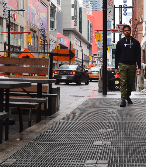 below: Streetcars on Queen West under the redesigned pedestrian walkway.