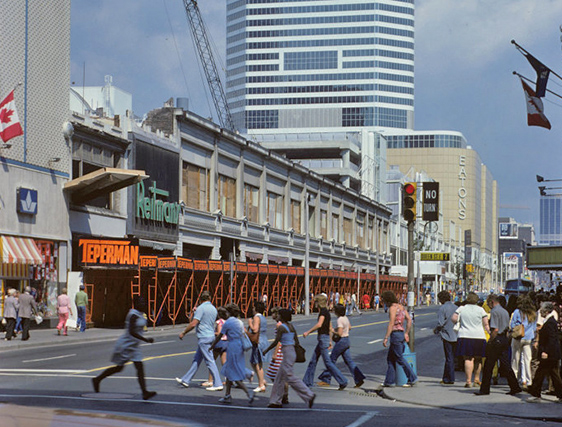 below: Looking north up Yonge Street from Queen back at a time when the new Eatons store at the north end of the Eaton Centre was built (at Dundas, completed 1977) but the old stores on the west side of Yonge hadn’t been completely demolished. This photo was found online on blogTO – here’s the link to their site if you are interested in the history of the Eaton Centre construction.