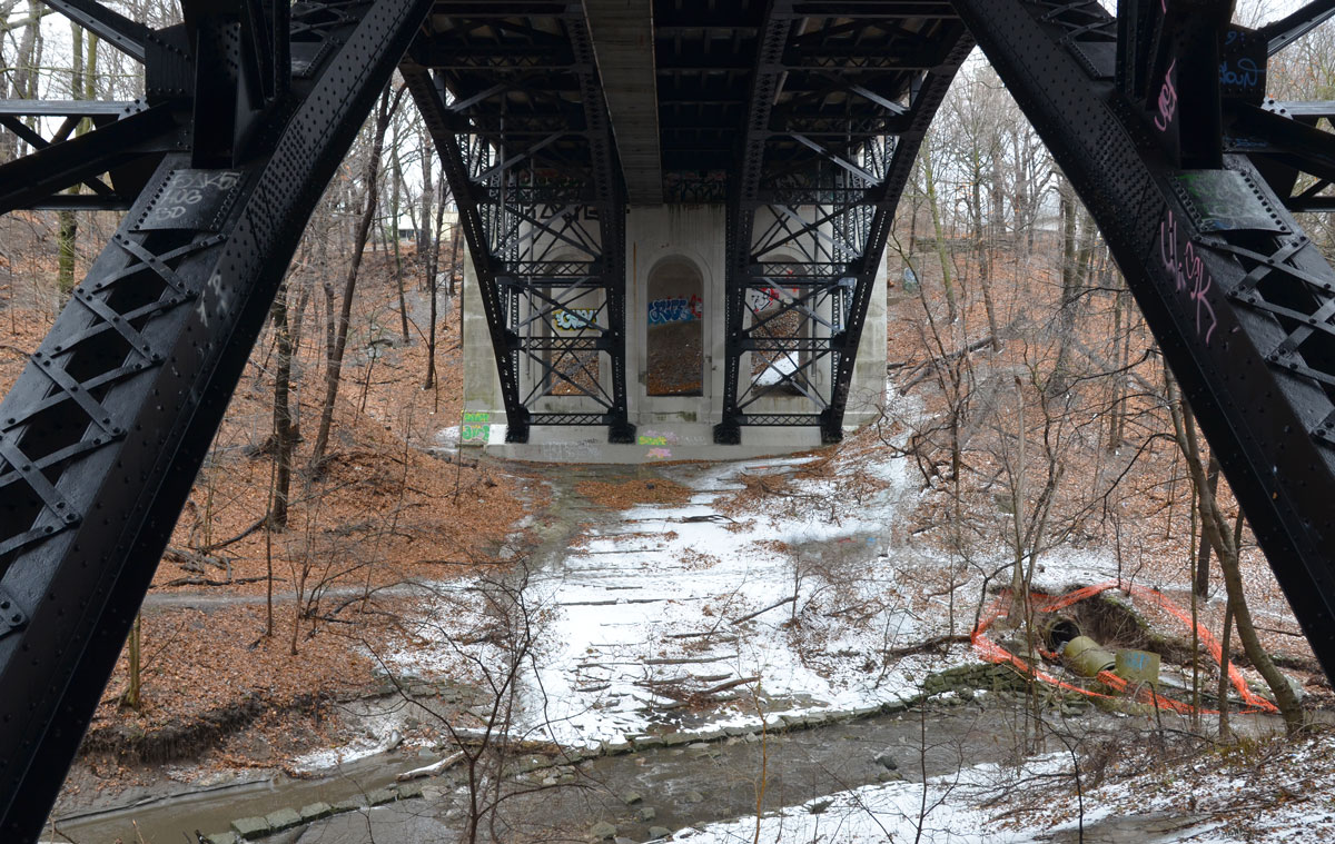 below: The East Don River flows diagonally under the Leslie Sheppard intersection. The black and white highrise in the distance is farther north up Leslie Street.