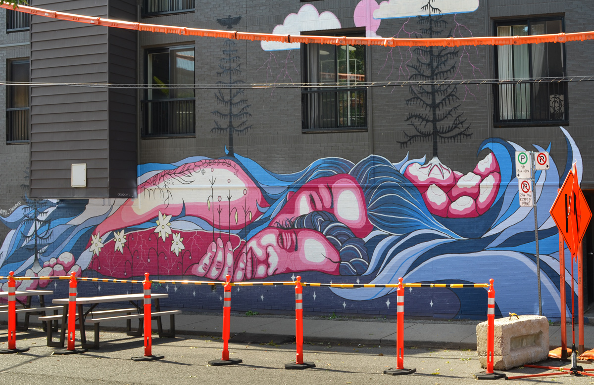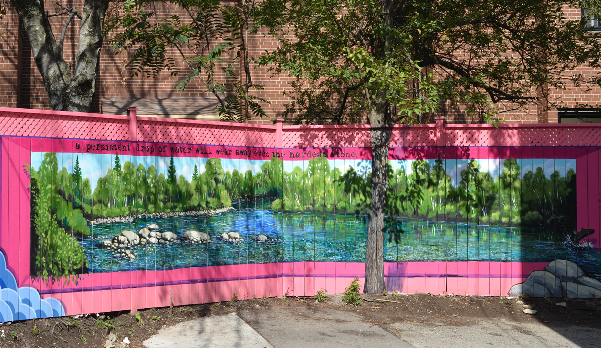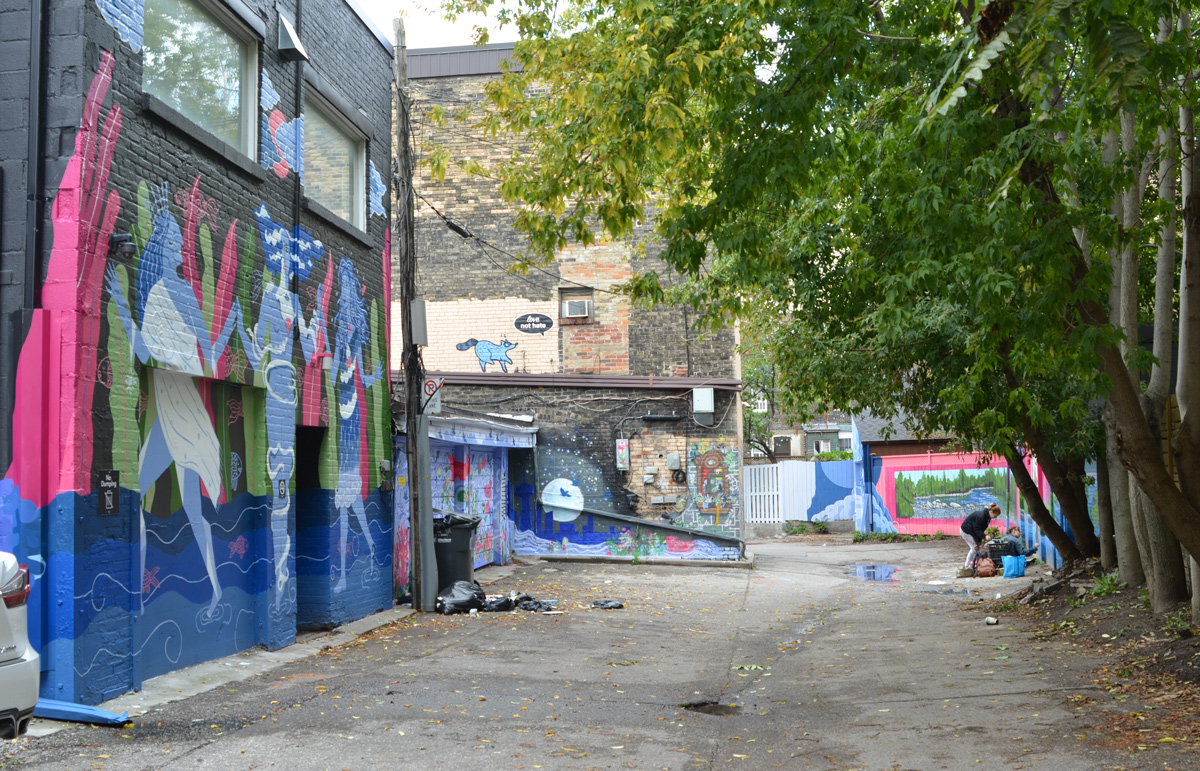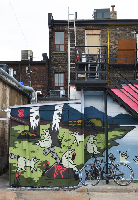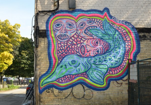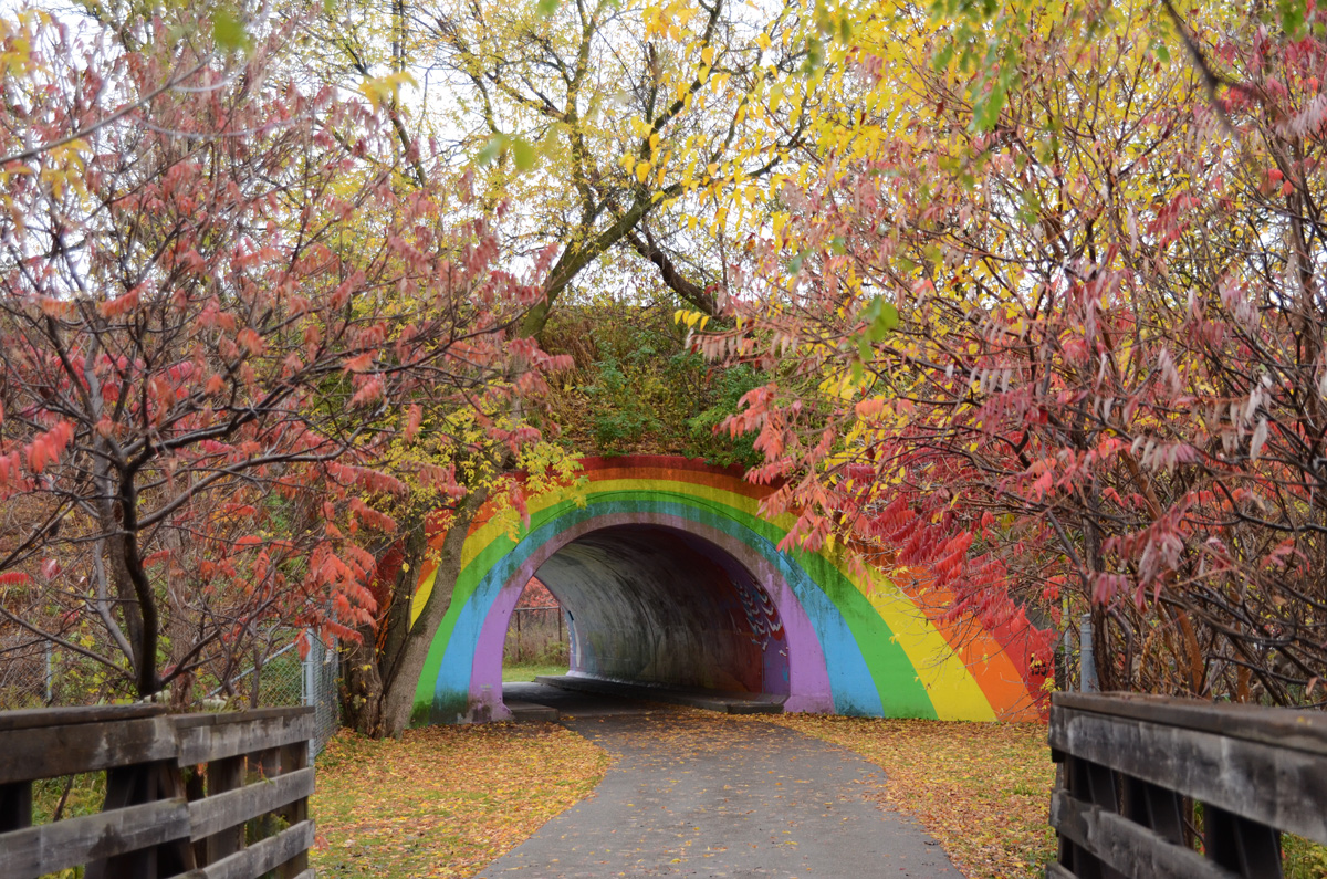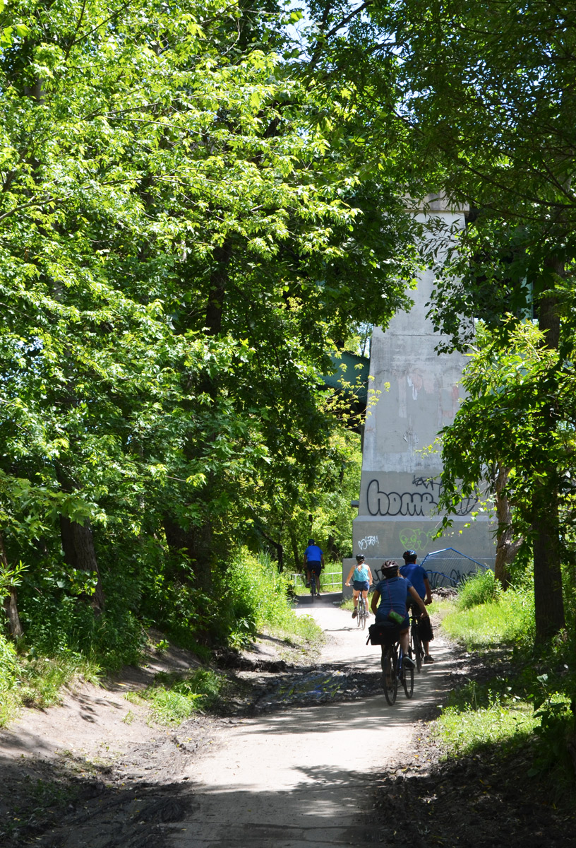 below: The building in the background was the Lever Brothers (the Unilever) soap factory. There is now a sign on the building that says firstgulf.com – they are the development company that owns the site. NOW magazine published an interesting story about the building as it looks at the moment (with lots of great pictures!). The path through the striped underpass joins the Don River Trail to Corktown Commons.