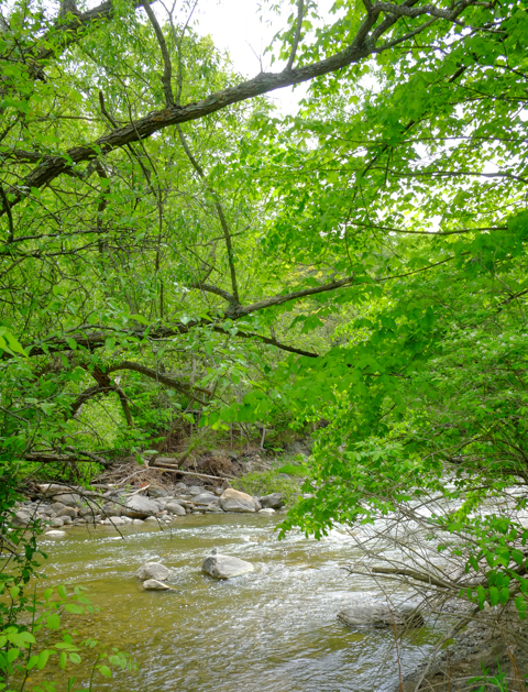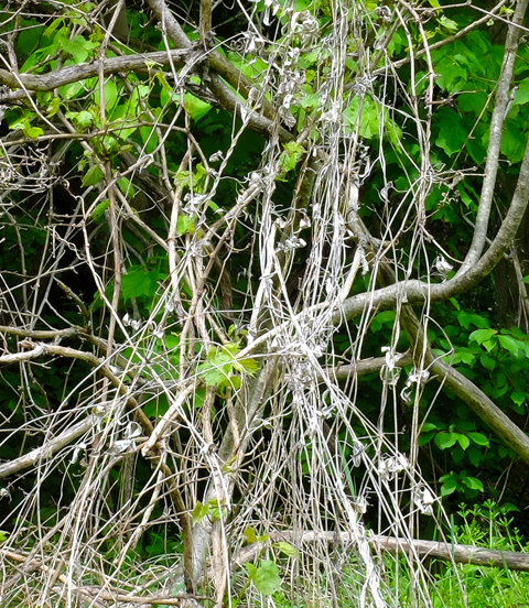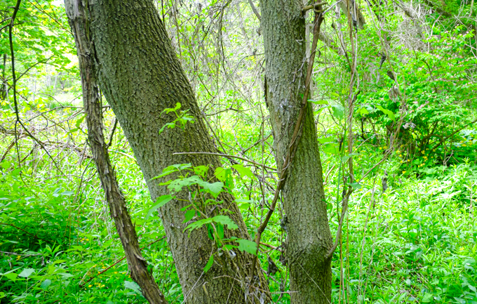 below: Another silent threat that lurks here (but won’t give you a rash) is an invasive vine. “Dog strangling vine”, or Vincetoxicum rossicum, wraps itself around trees and other plants that it encounters. It is early in the growing season so most of the plants here were still short but there were masses of them. The lighter beige curved objects that run through the middle of this photo are the remains of last year’s vines.