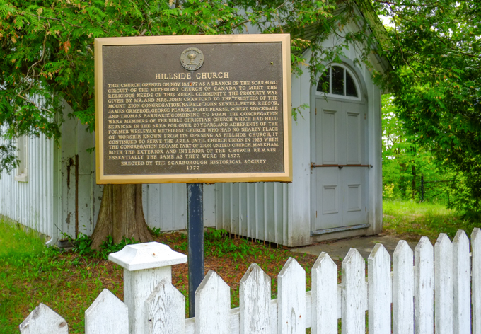 Hillside Church – The church opened on Nov 16, 1877 as a branch of the Scarboro circuit of the Methodist Church of Canada to meet the religious needs of this rural community. The property was given by Mr. and Mrs. John Crawford to the “Trustees of the Mount Zion Congregation” – namely John Sewell, Peter Reesor, James Ormerod, George Pearse, James Pearse, Robert Stockdale and Thomas Barnard. Combining to form the Congregation were members of the Bible Christian Church … and the adherents of the former Wesleyan Methodist Church. Known from its opening as Hillside Church, it continued to serve the area until Church Union in 1925 when the congregation became part of Zion United Church, Markham. Both the exterior and the interior of the church remain essentially the same as they were in 1877.