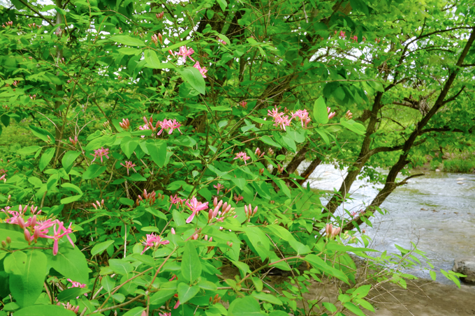 below: Little pink honeysuckle flowers