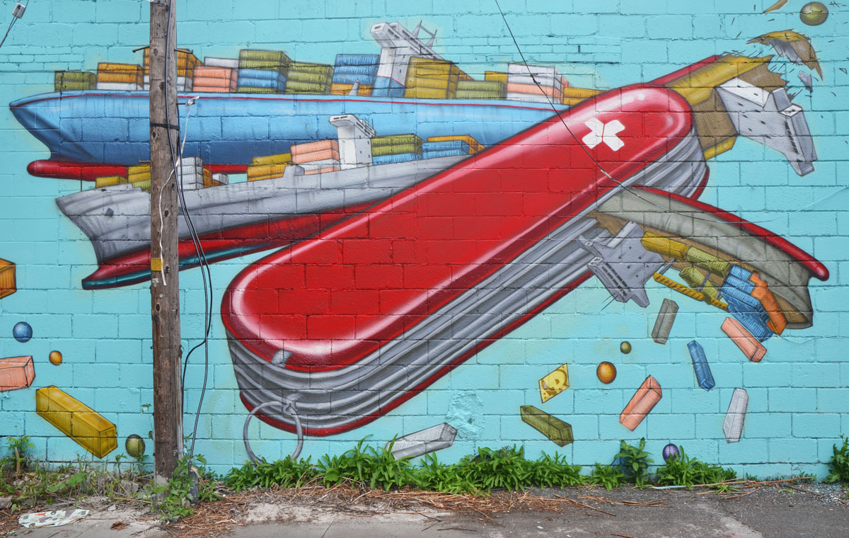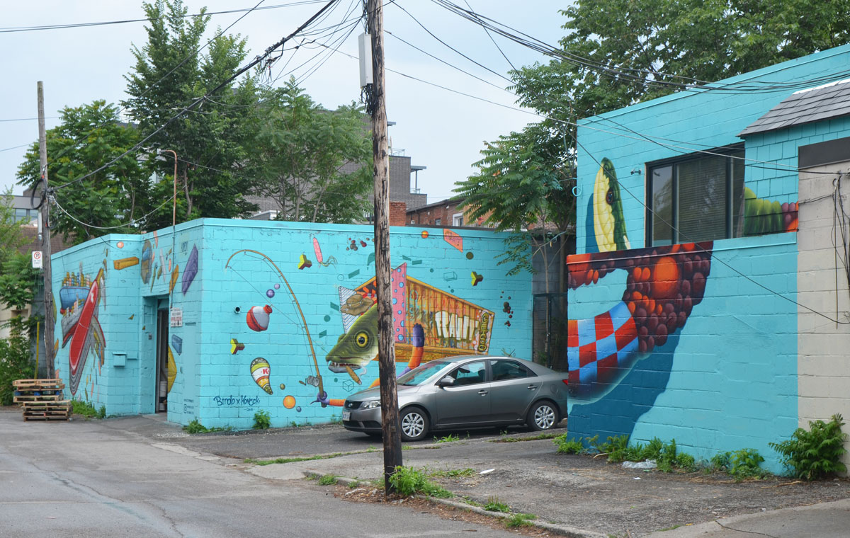 Near the ‘mouth of the Don River’ (in reality, where the Don River turns into the Keating Channel), there are some new murals on the bents supporting the ramps between the DVP and the Gardiner Expressway. They are part of the Love Letter to the Great Lakes project. A previous blog post, love letters in paint, concerned the murals from this project that were painted near Ossington and Queen West.